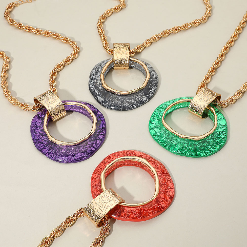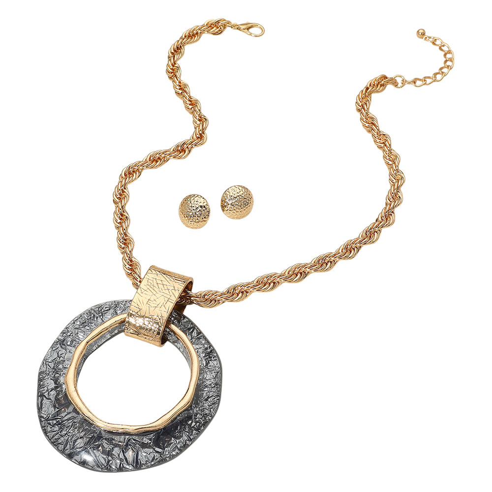 Details • Necklace Size : 20.5" + 3.25" L • Pendant Size : 3.4" X 4" • Earrings Size : 0.7" L • Modern pendant necklace and earring set featuring a bold textured circular pendant on a chunky chain. Perfect statement jewelry for parties, evenings out, or elevating casual looks, this set brings an artistic edge and sophisticated flair to any outfit with its unique, contemporary design. • Lead and Nickel Compliant