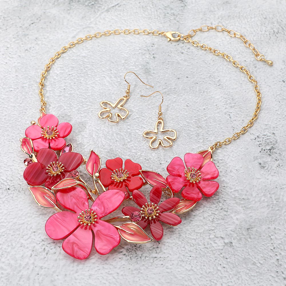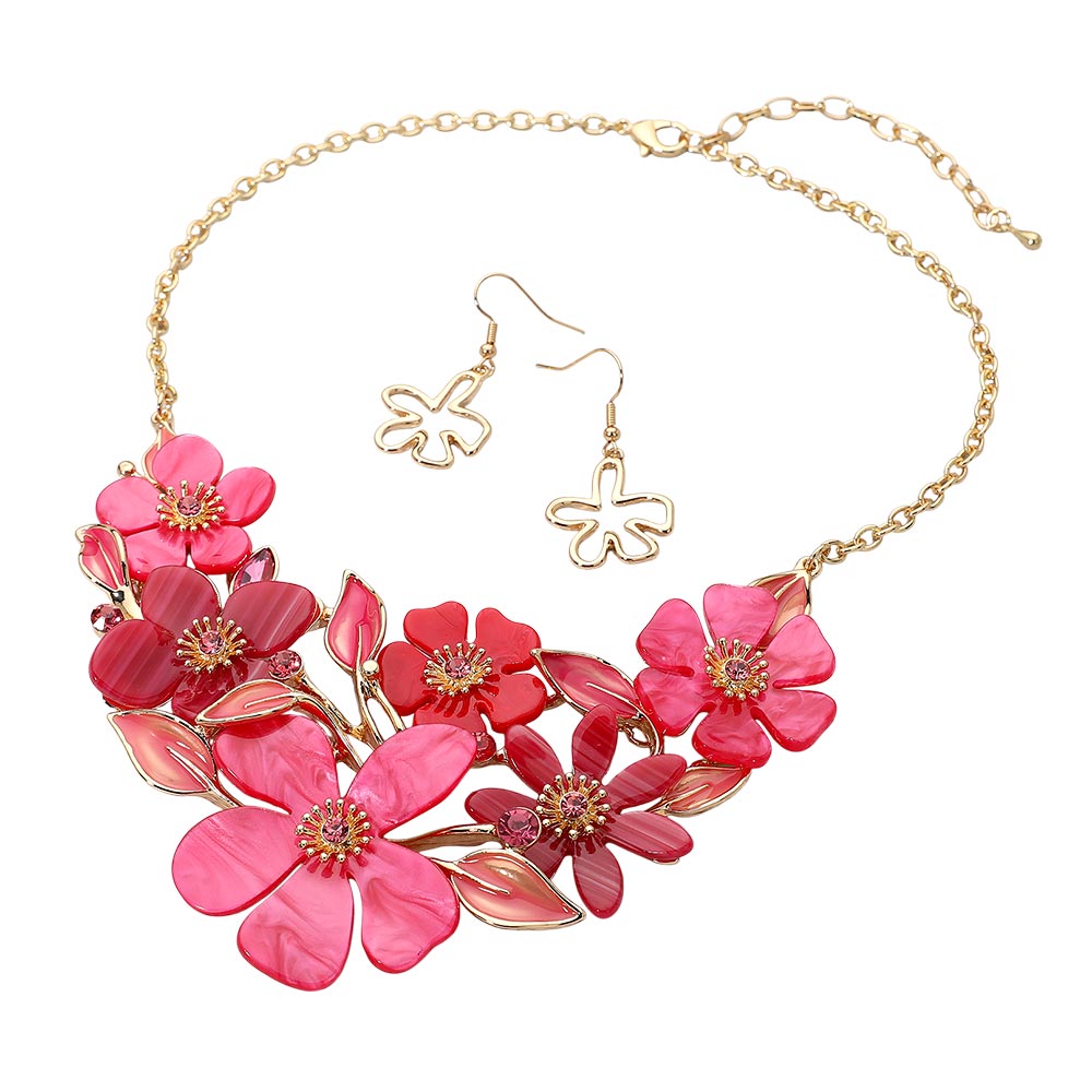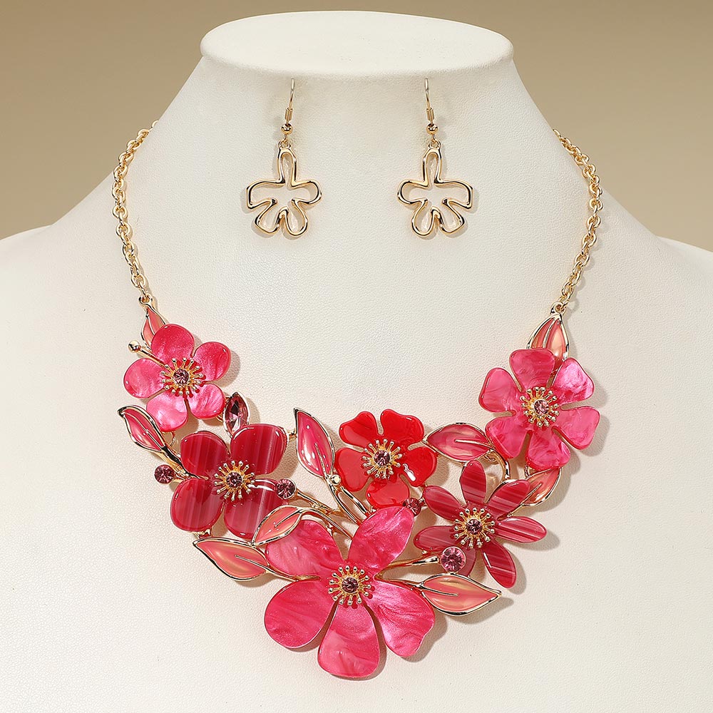 • This floral statement necklace and earring set showcases beautifully layered petals and delicate leaf accents, creating a bold yet elegant look. Perfect for special occasions or evening events, this coordinated set adds a sophisticated, feminine charm that enhances any ensemble.