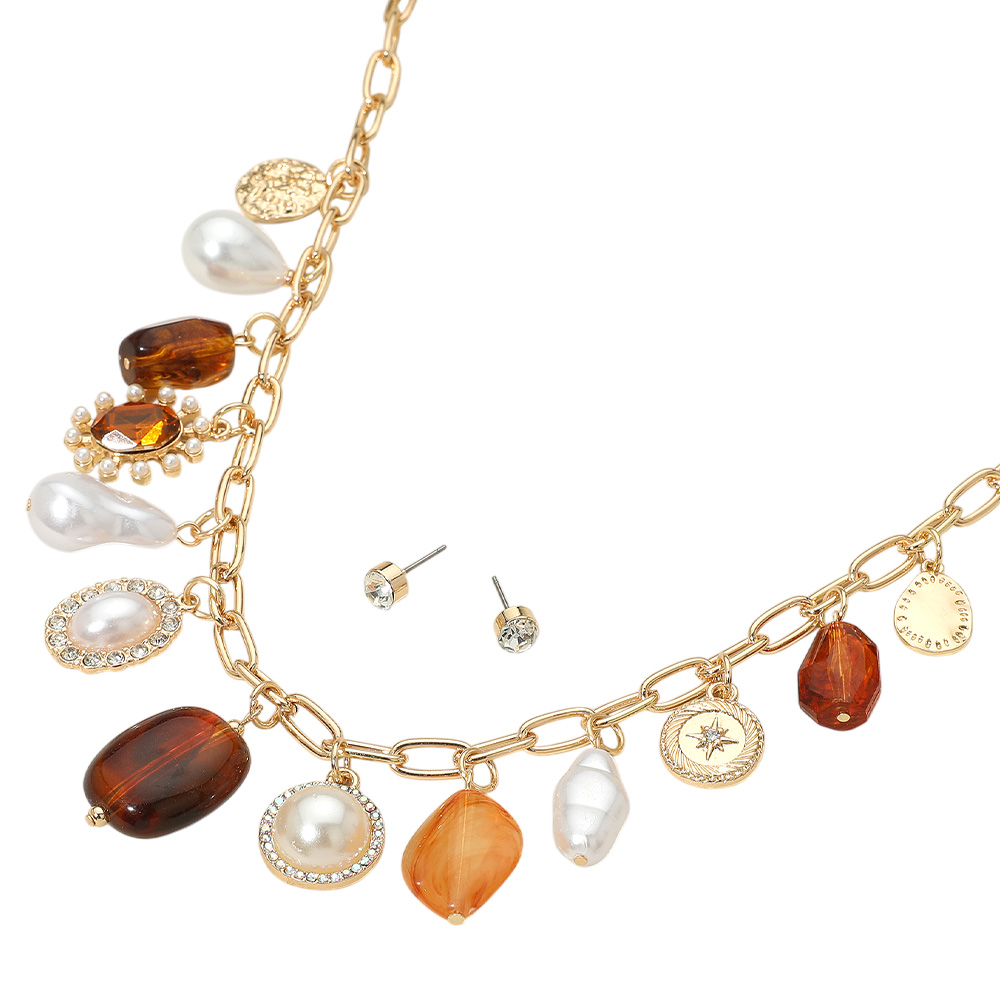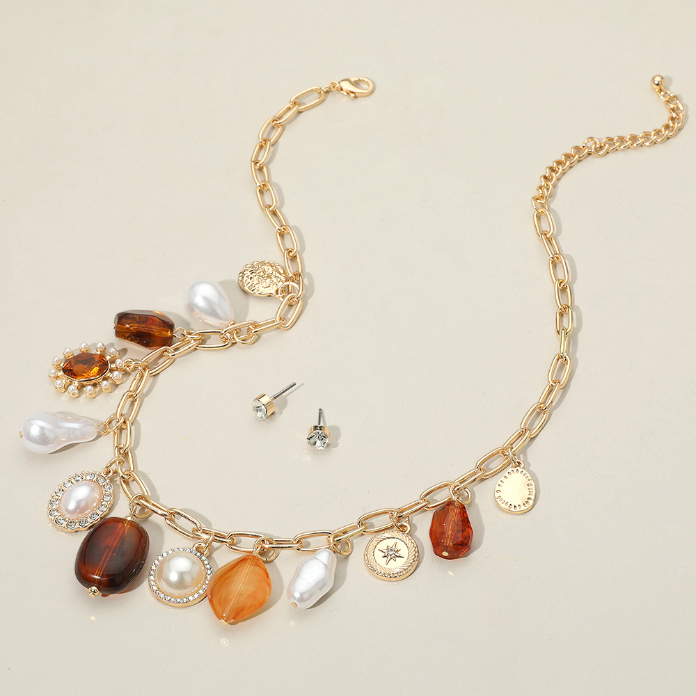 Resin Pebble Pearl Metal Medal Charm Station Necklace
