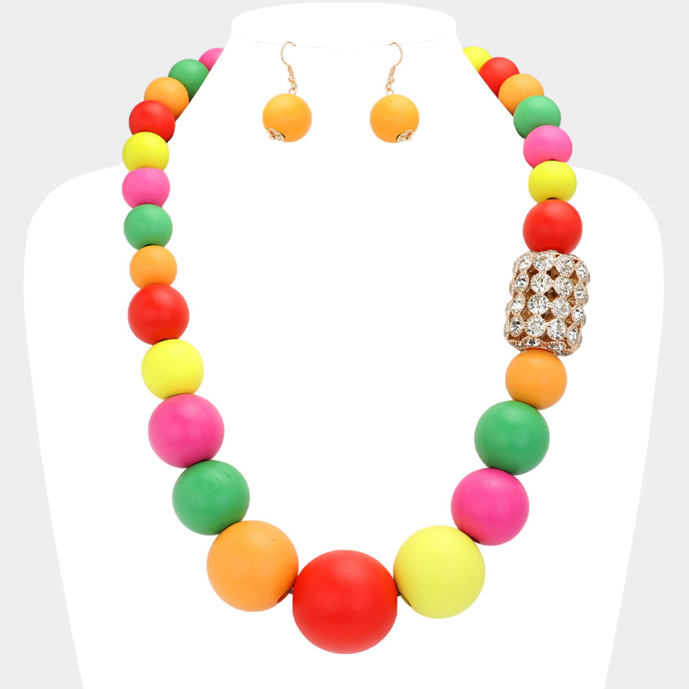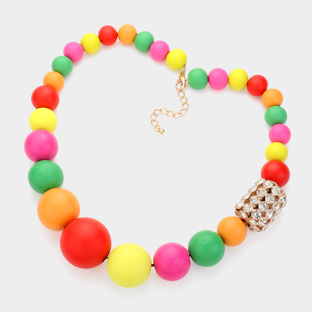 Rhinestone Cluster Pointed Oversized Wood Ball Statement Necklace