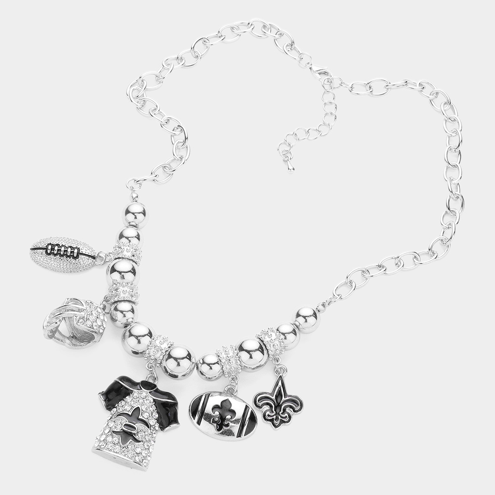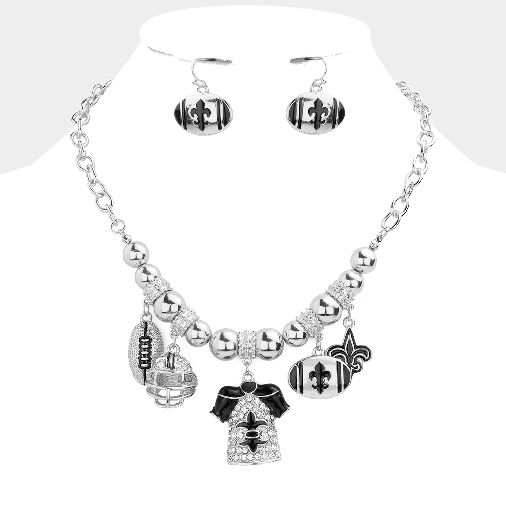 Rhinestone Embellished Fleur de Lis Accented Football Helmet Uniform Pendant Necklace