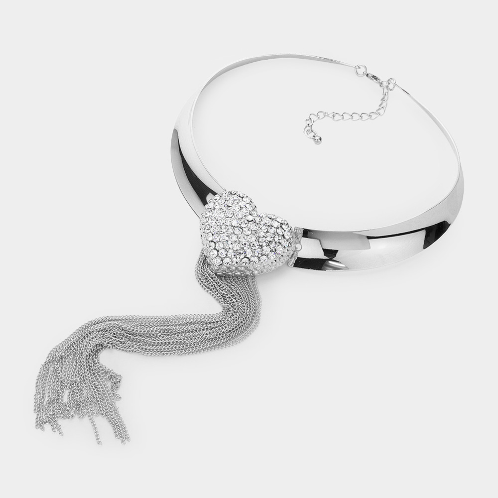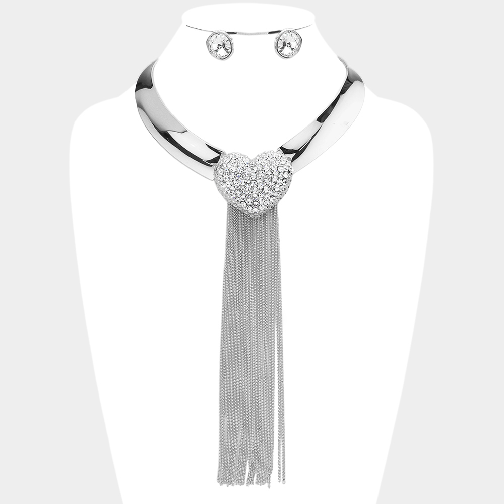 Rhinestone Embellished Heart Long Dropped Metal Chain Tassel Necklace