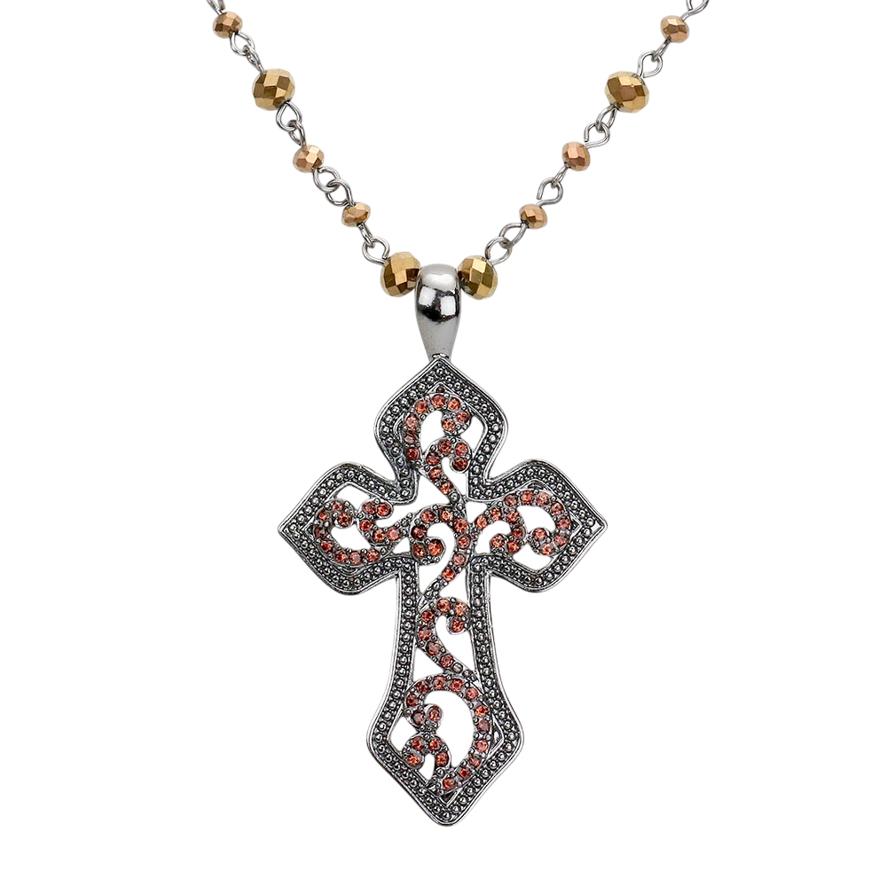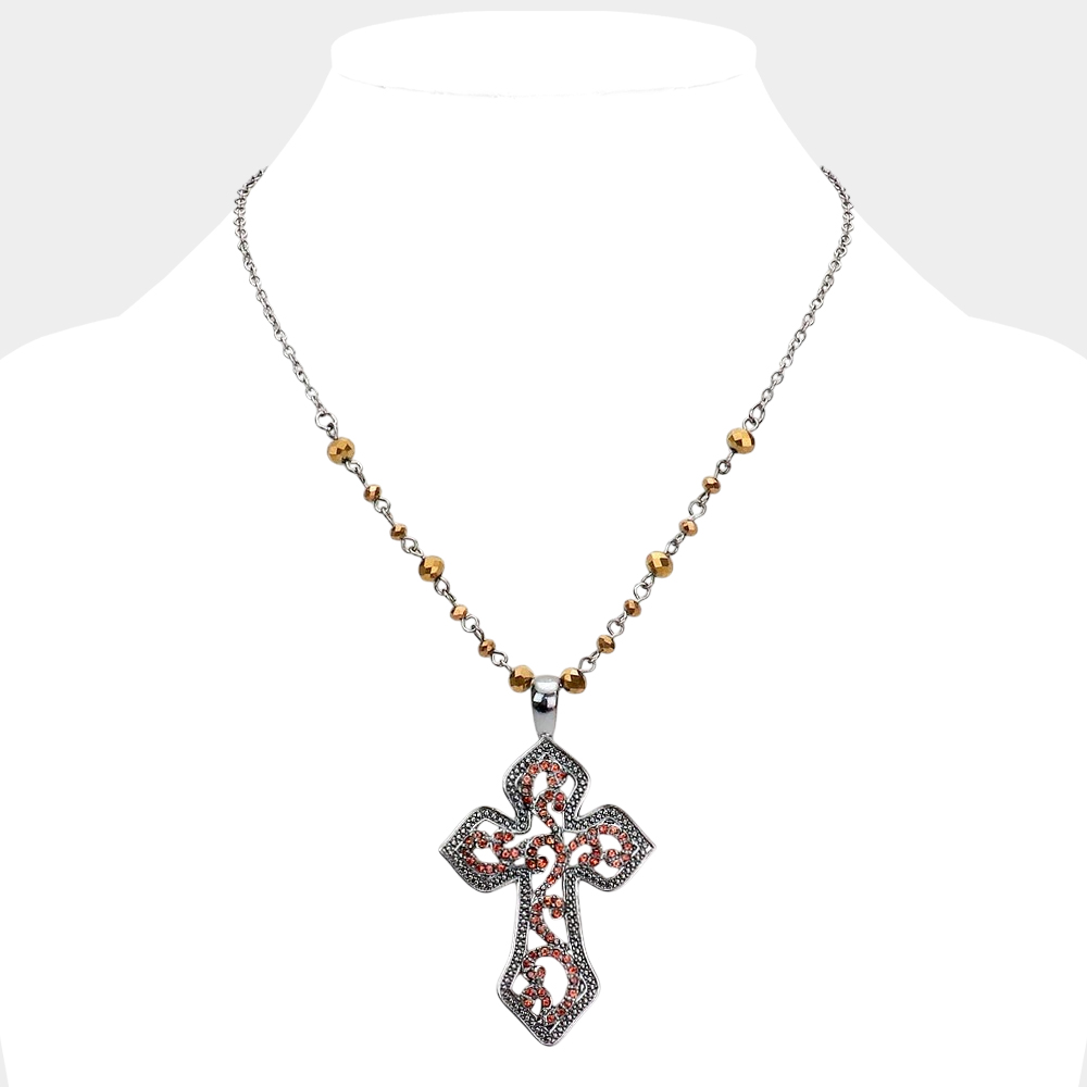 Rhinestone Embellished Metal Cross Pendant Necklace