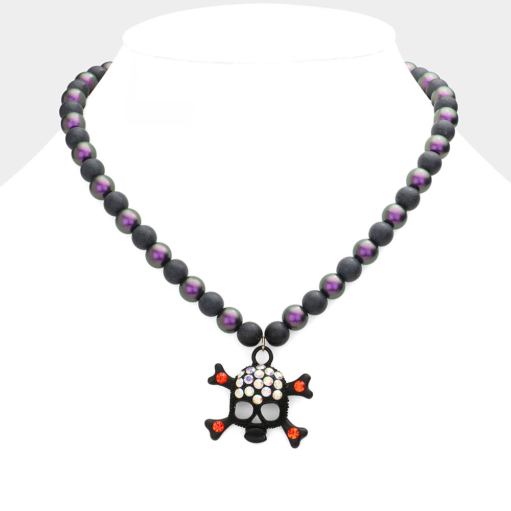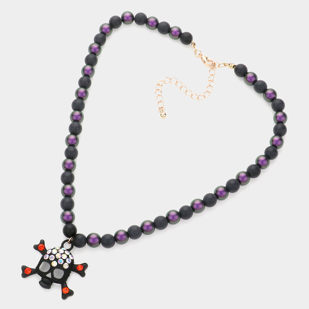 Details • Necklace Size : 16" + 3.5" L • Pendant Size : 1.25" X 1.2" • Complete your spooky ensemble with this Halloween necklace featuring purple-accented beads and a sparkling skull-and-crossbones pendant. Perfect for costumes, parties, or adding a playful gothic edge to any outfit. • Lead and Nickel Compliant