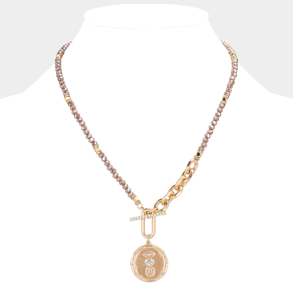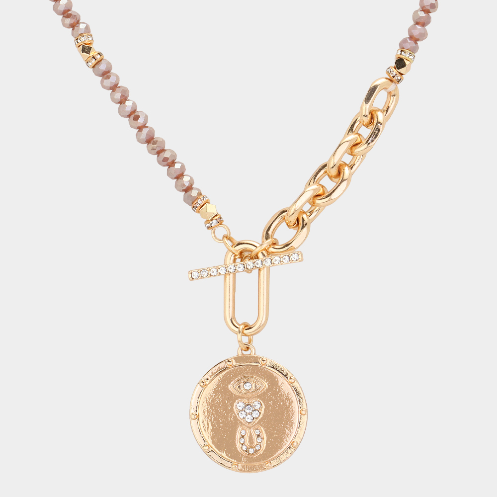 Rhinestone Evil Eye Heart Horseshoe Accented Metal Round Pendant Faceted Beaded Necklace