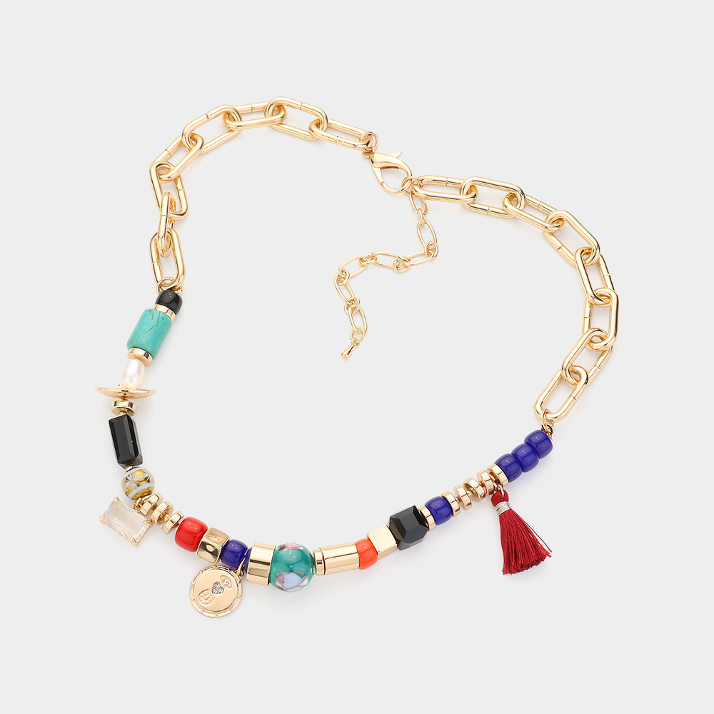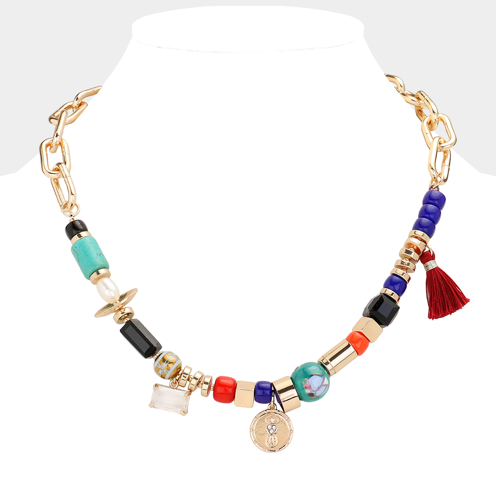 Rhinestone Evil Eye Heart Horseshoe Metal Disc Tassel Pendant Freshwater Pearl Multi Beaded Necklace