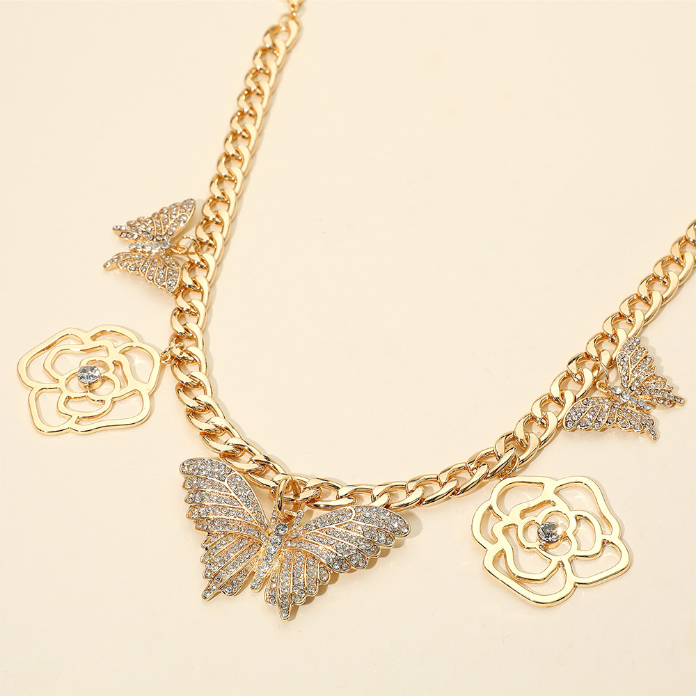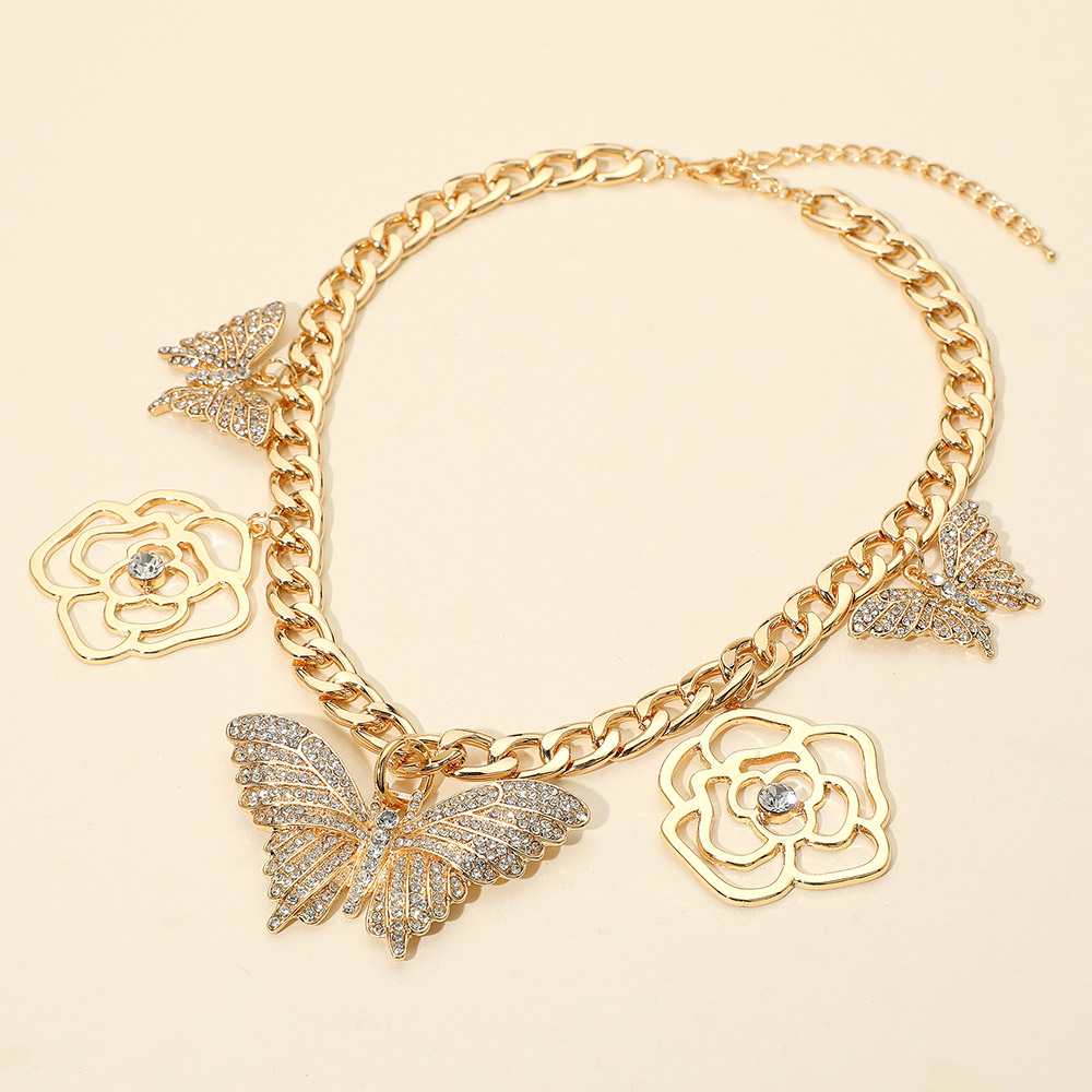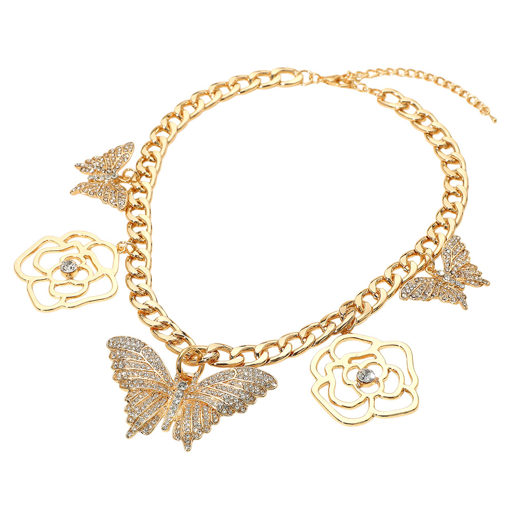 Details • Necklace Size : 16.5" + 3" L • Decor Size : 1.25" L • Elegant chain necklace adorned with butterfly and flower charms accented with sparkling stones. A stylish statement piece that adds whimsical charm and feminine flair to everyday or special occasion looks. • Lead and Nickel Compliant