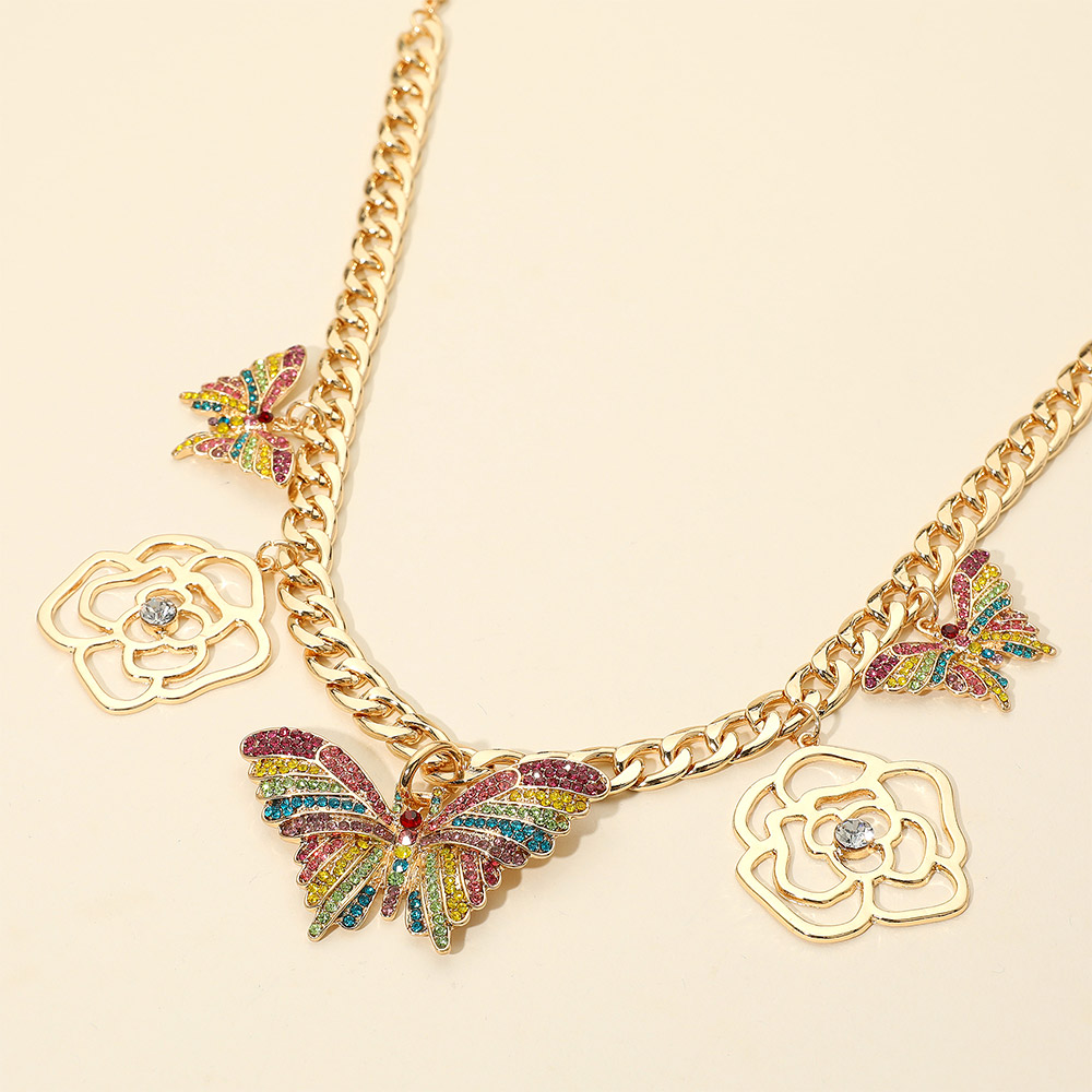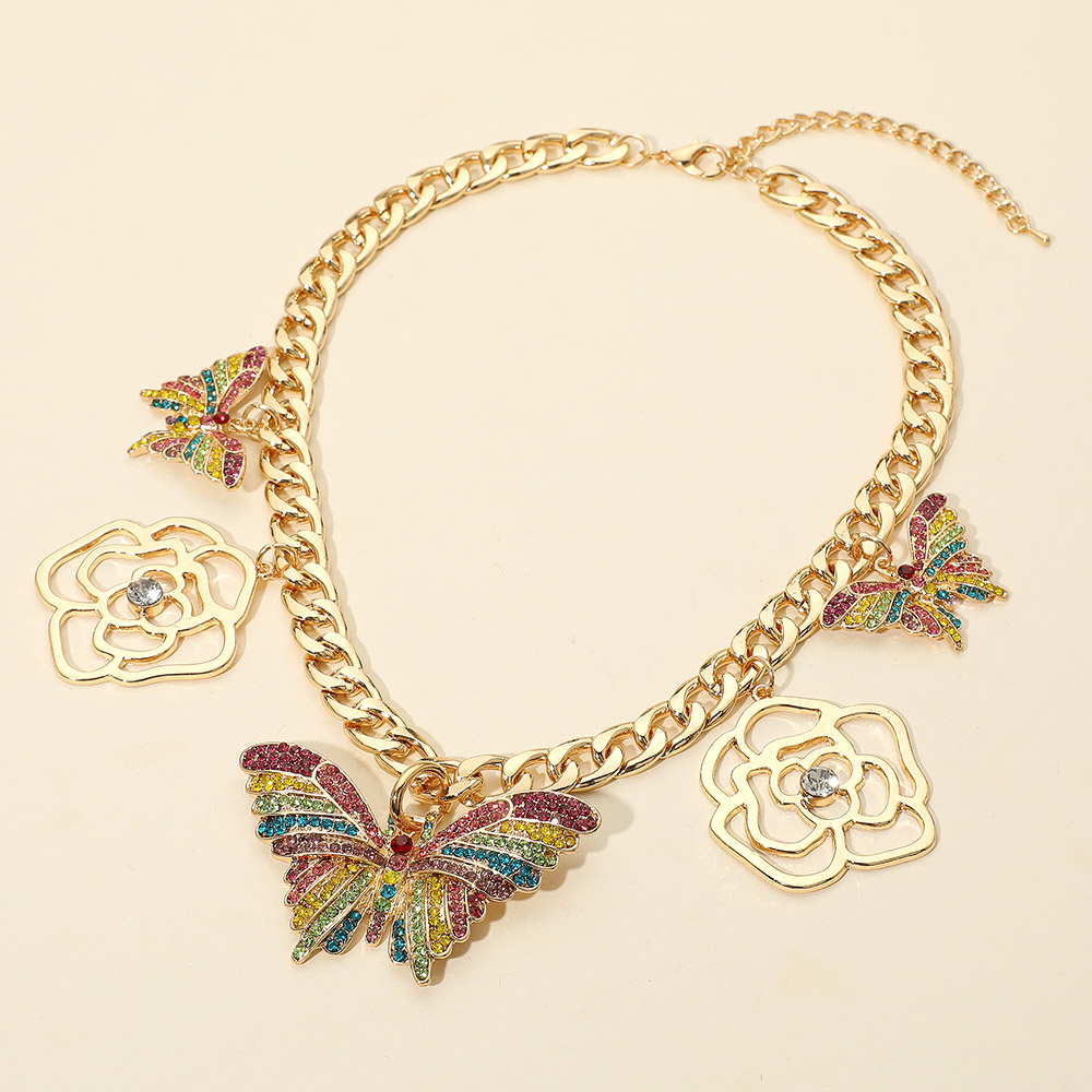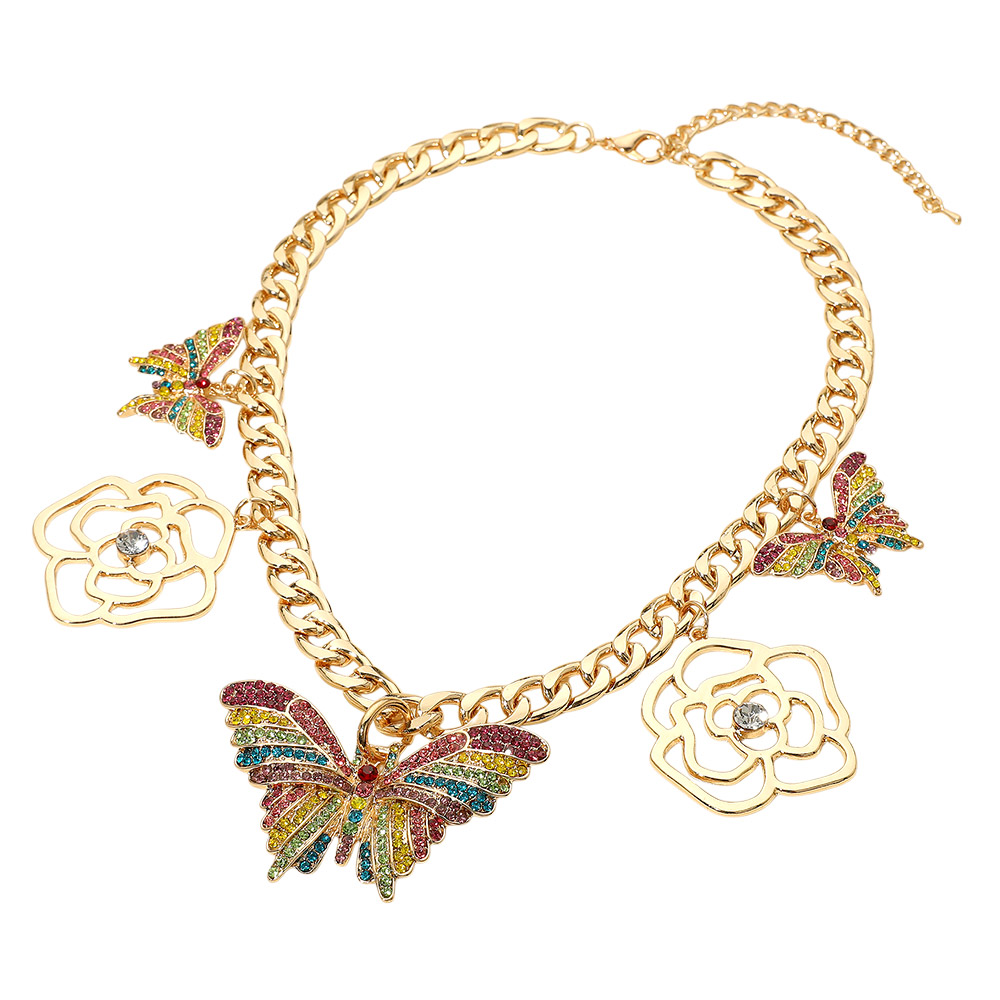 Rhinestone Paved Butterfly Flower Charm Station Statement Necklace