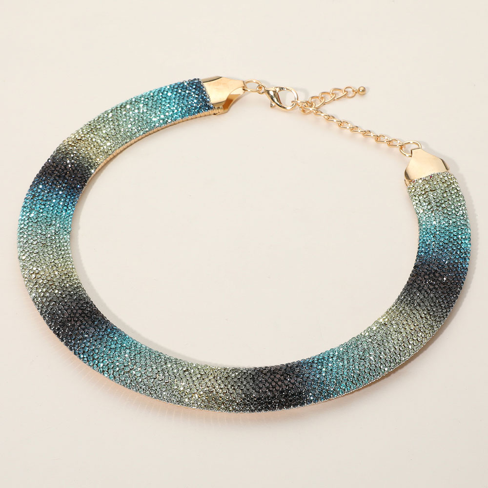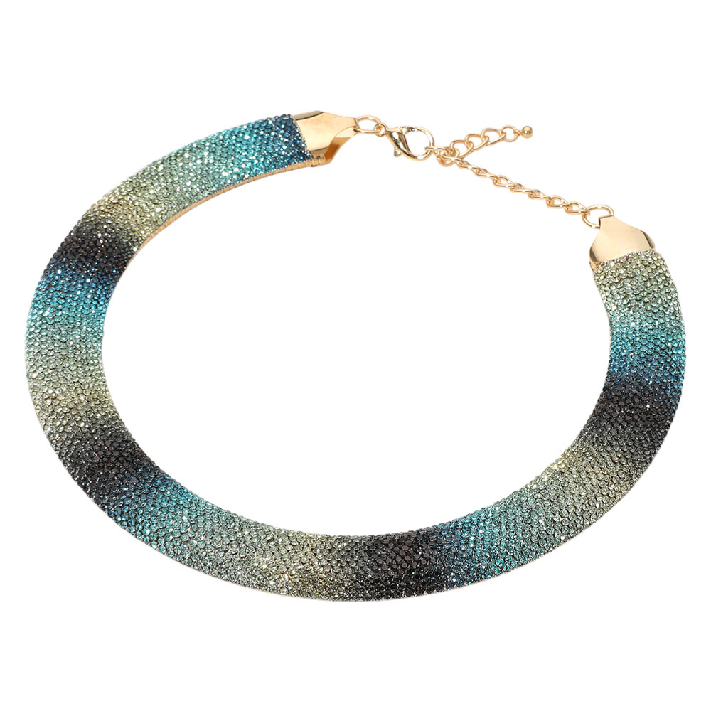 • Statement collar necklace fully embellished with rhinestones for maximum sparkle. Designed with a wide silhouette that hugs the neckline, this glamorous piece adds bold elegance to formal or evening looks.
