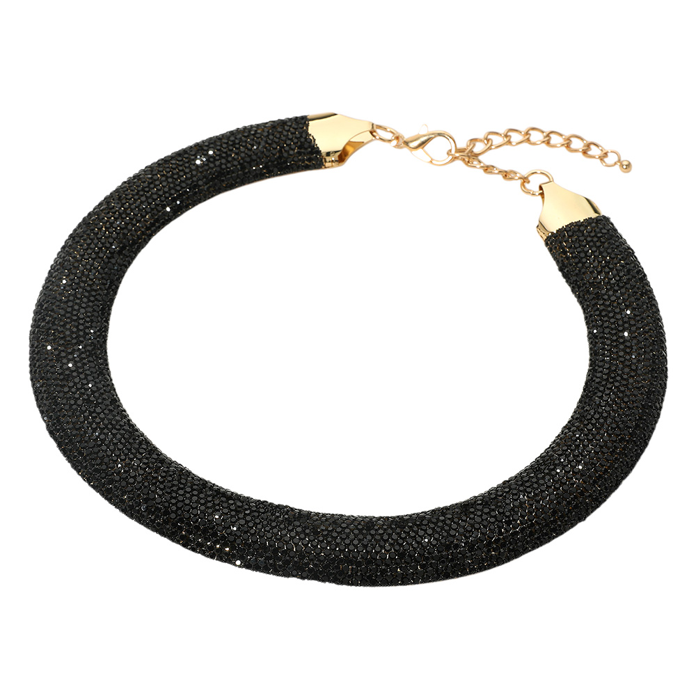 • Statement collar necklace fully embellished with rhinestones for maximum sparkle. Designed with a wide silhouette that hugs the neckline, this glamorous piece adds bold elegance to formal or evening looks.