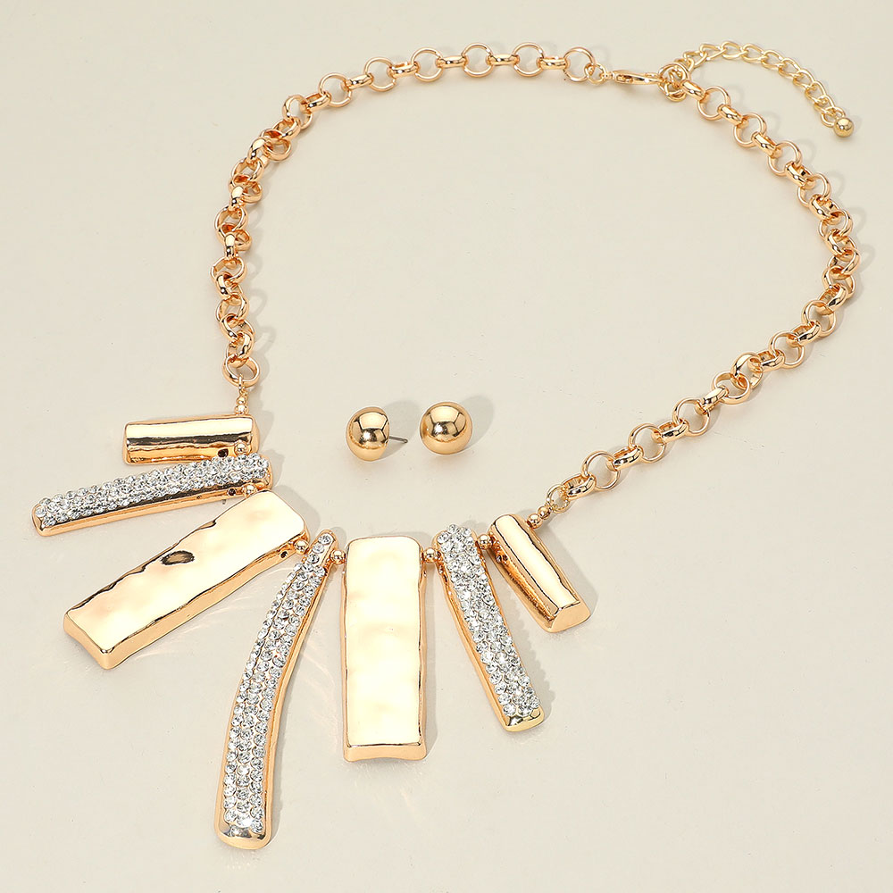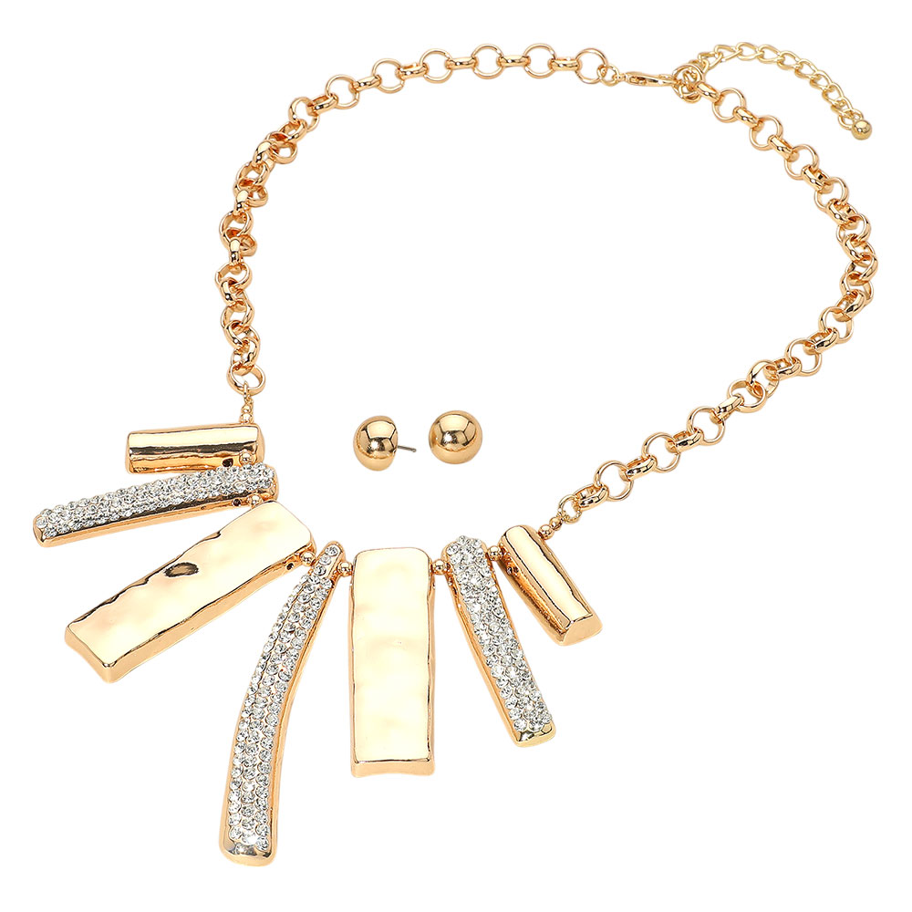 Rhinestone Paved Hammered Geometric Metal Bar Statement Necklace