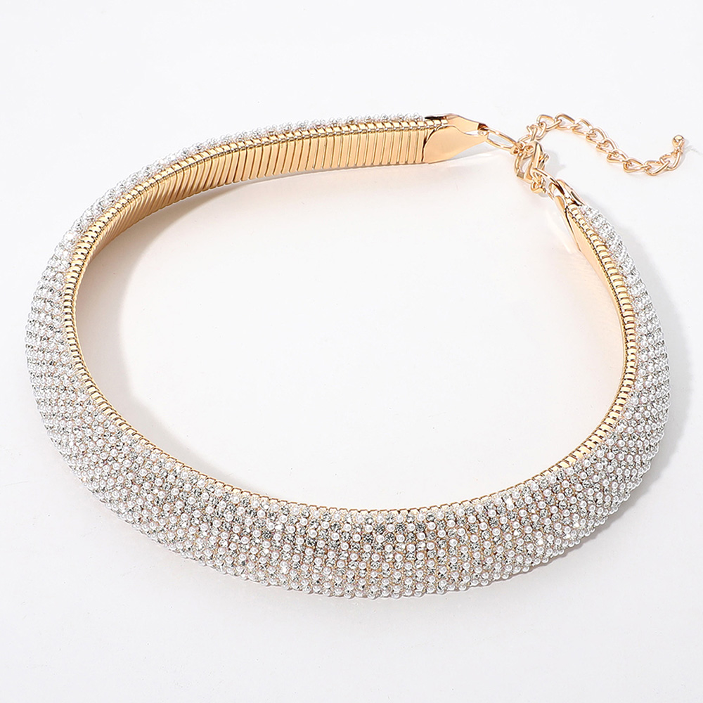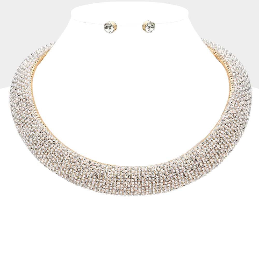 • Statement collar necklace fully embellished with rhinestones for maximum sparkle. Designed with a wide silhouette that hugs the neckline, this glamorous piece adds bold elegance to formal or evening looks.