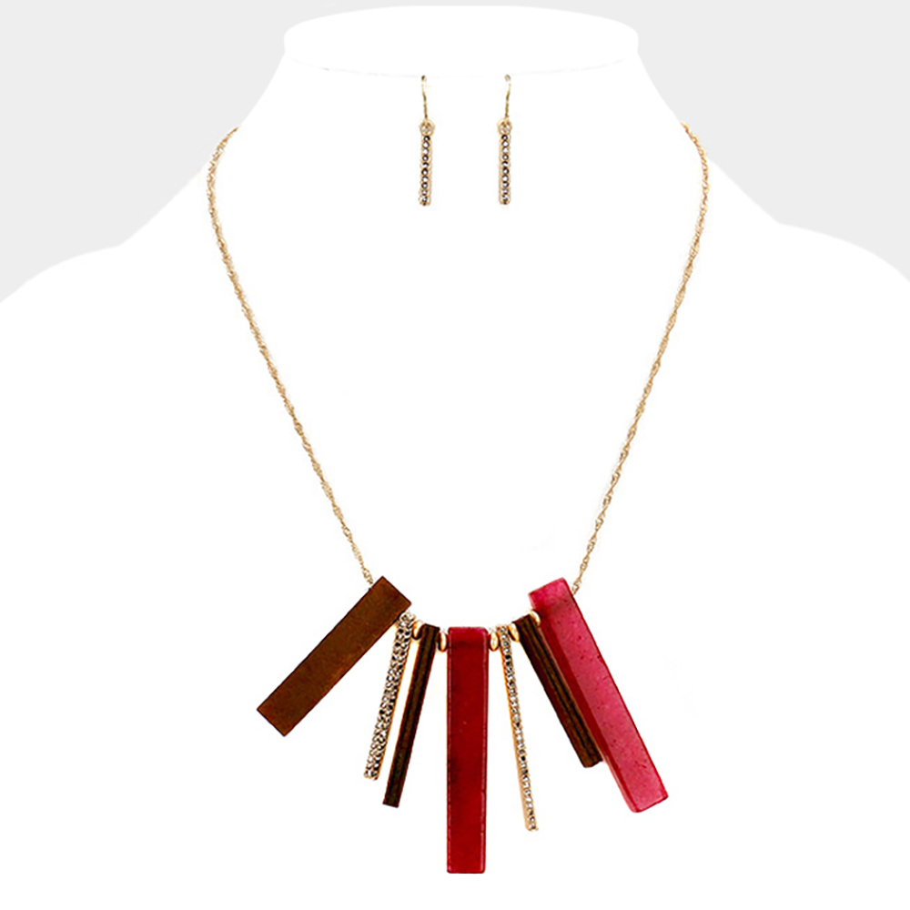 Rhinestone Rectangular Bead Wood Bar Statement Necklace