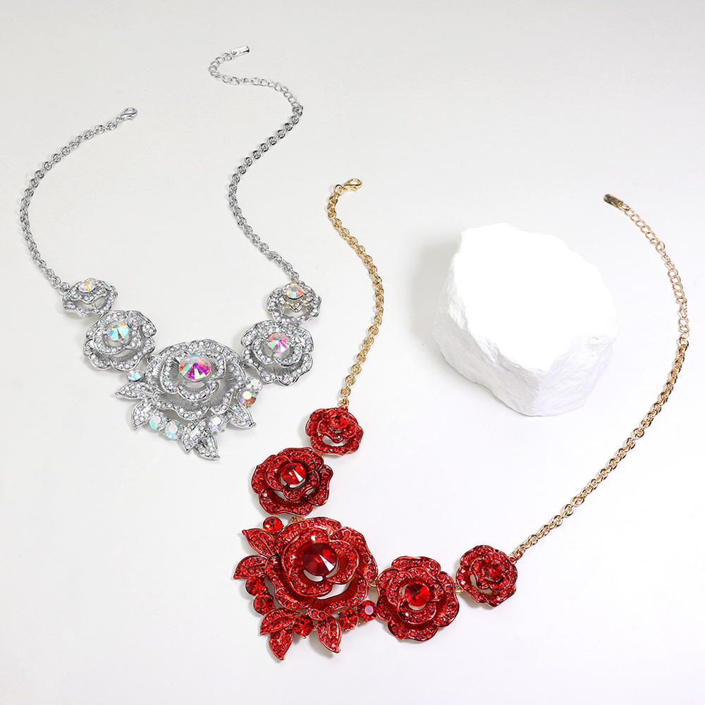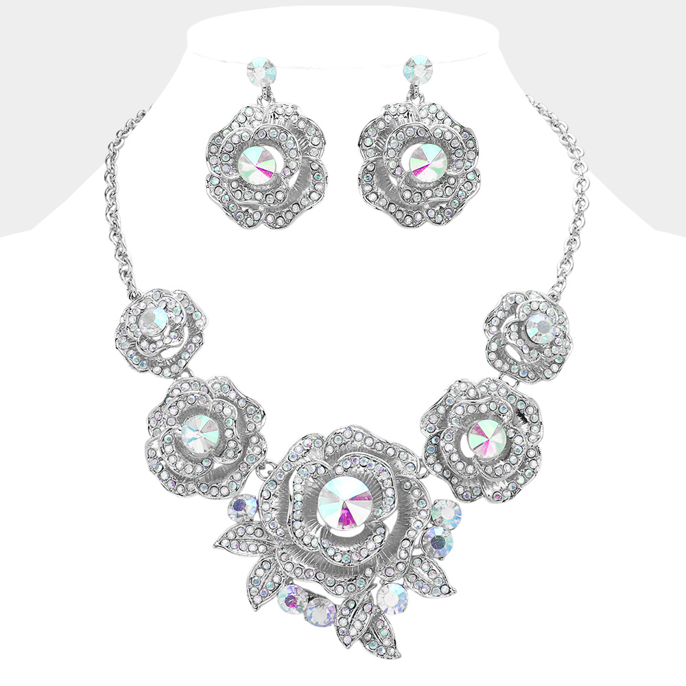 Round Stone Accented Rhinestone Paved Rose Embellished Statement Necklace