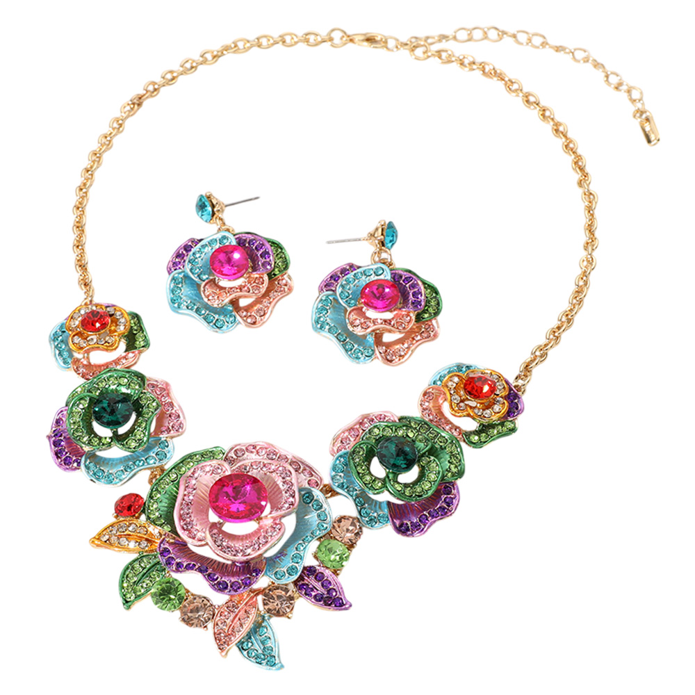 Round Stone Accented Rhinestone Paved Rose Embellished Statement Necklace