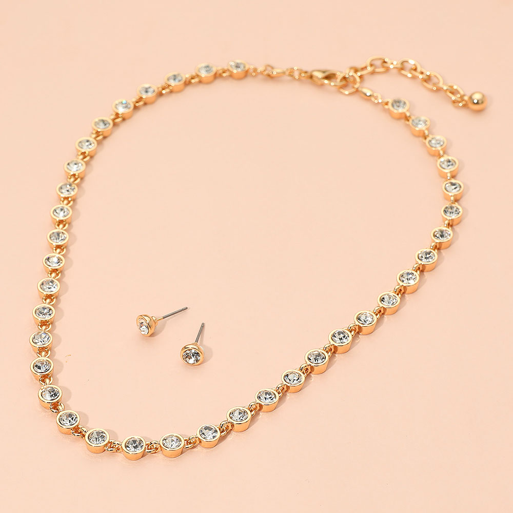 • Add a touch of sparkle to your style with this rhinestone necklace and stud earring set. Featuring dazzling stones in a refined design, this elegant duo offers timeless sophistication for both everyday wear and special occasions, enhancing any outfit with radiant charm.
