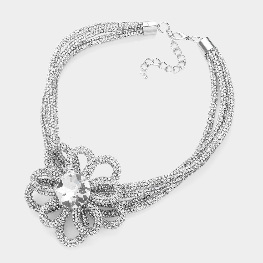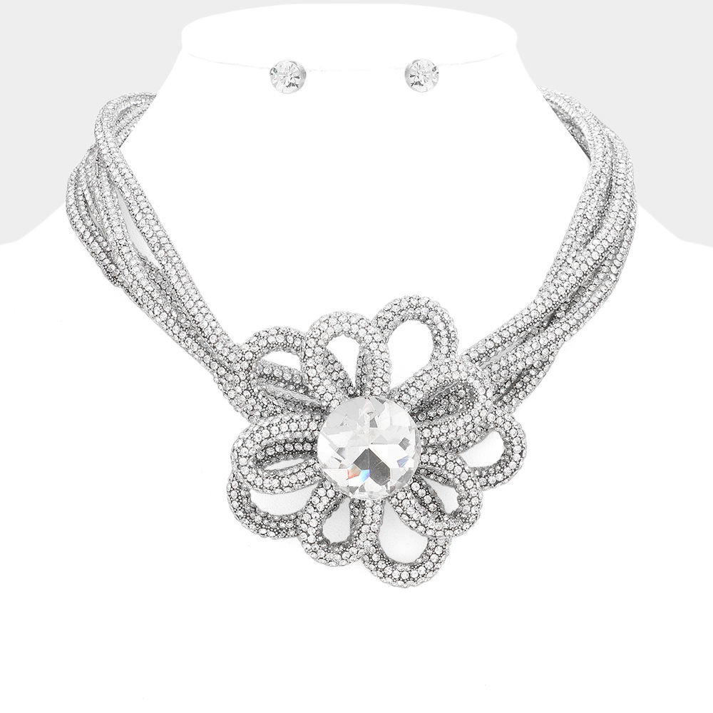 Round Stone Pointed Bling Studded Flower Pendant Necklace
