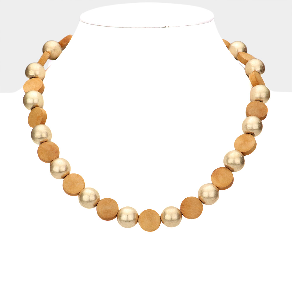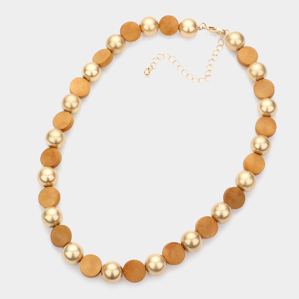 Wood Heishi Beaded Abalone Crescent Pendant Triple Layered Pendant Necklace