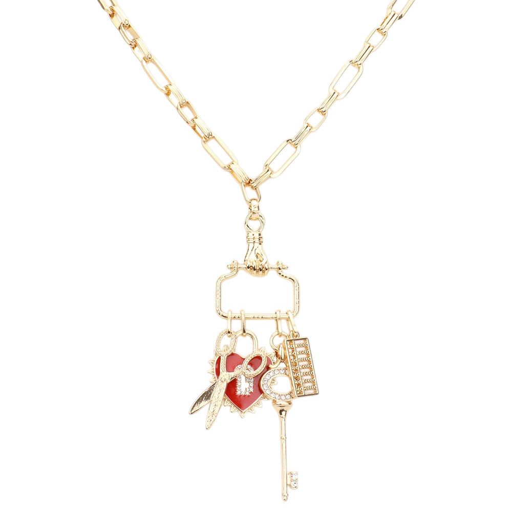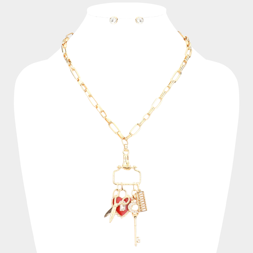 Brushed Metal Heart Cross Pearl Charm Station Chunky Necklace