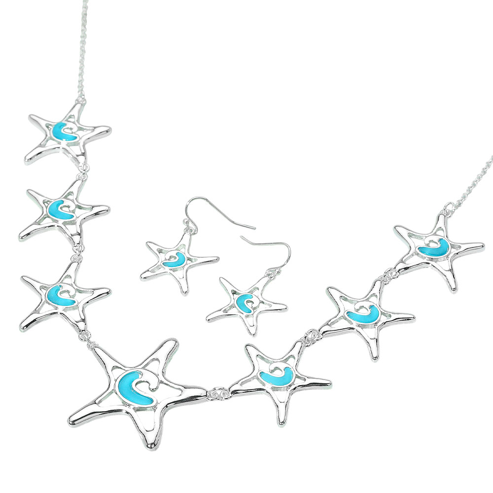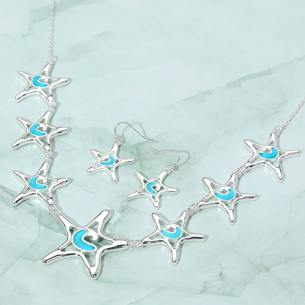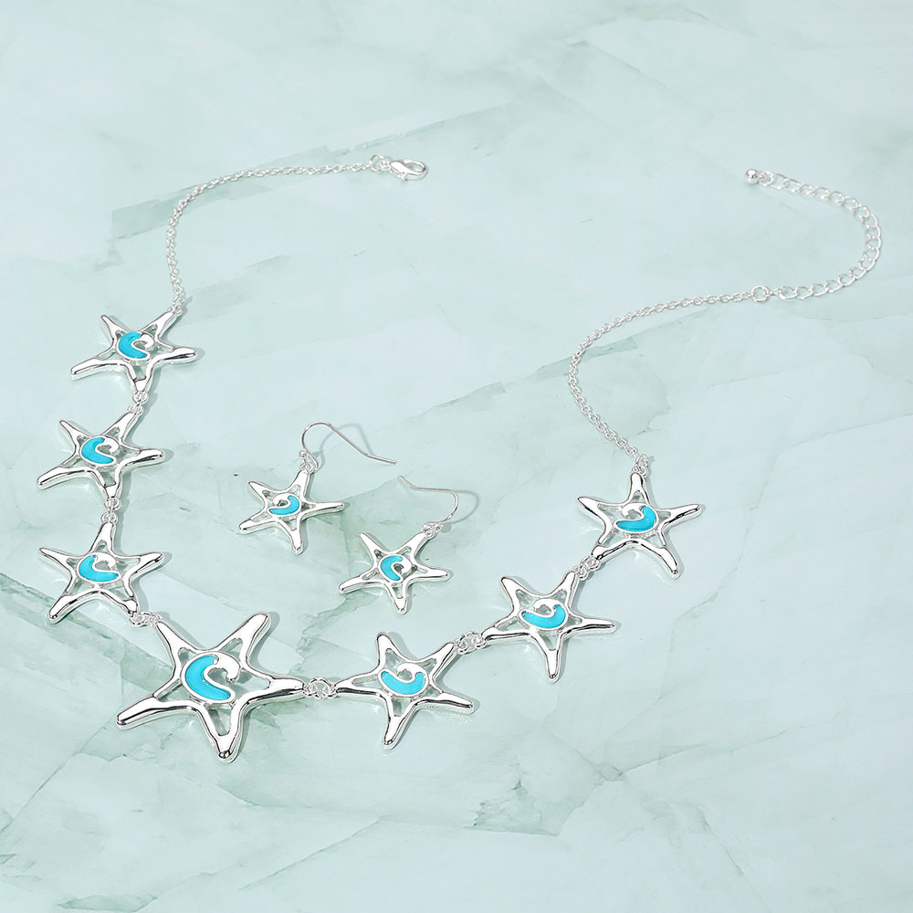 Stone Paved Bow Metal Starfish Fish Shell Pearl Tropical Leaf Charm Station Necklace