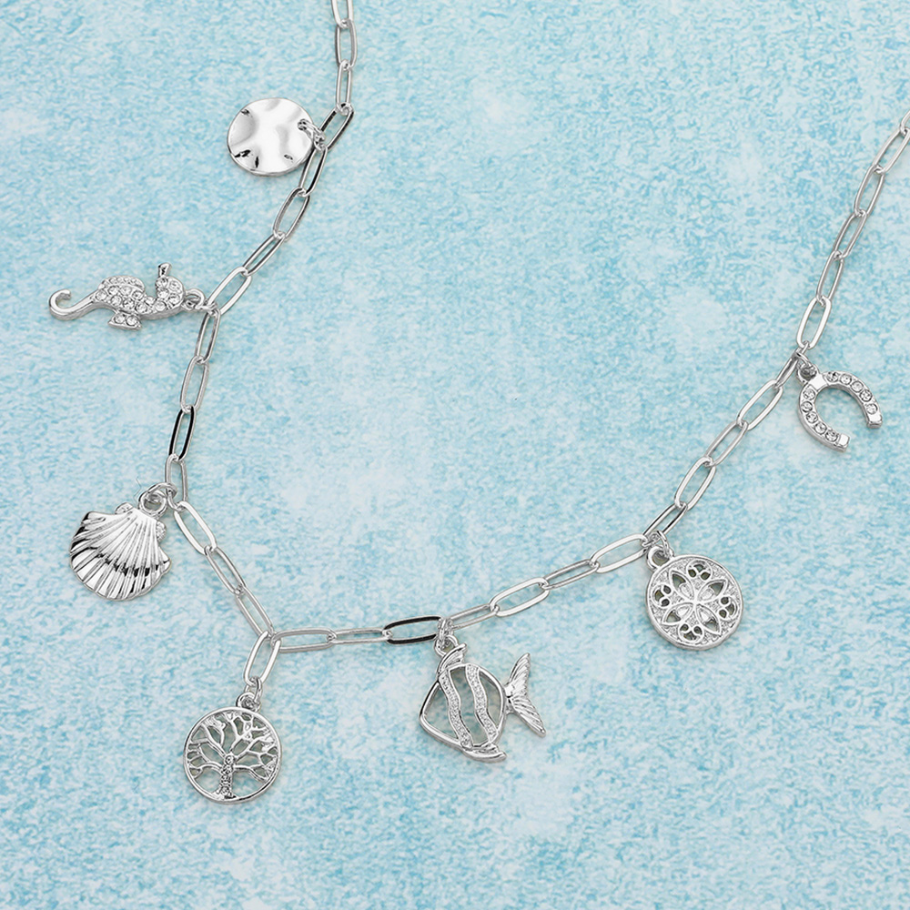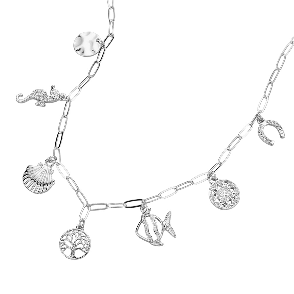 Details • Necklace Size : 16" + 3.25" L • Decor Size : 1.1" L • This ocean inspired charm necklace features playful pendants including seashell, seahorse, dolphin, and other marine symbols on a modern linked chain. A stylish accessory that brings seaside vibes to your everyday look or adds a unique accent to special occasions. • Lead and Nickel Compliant