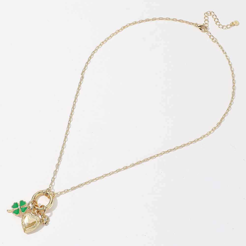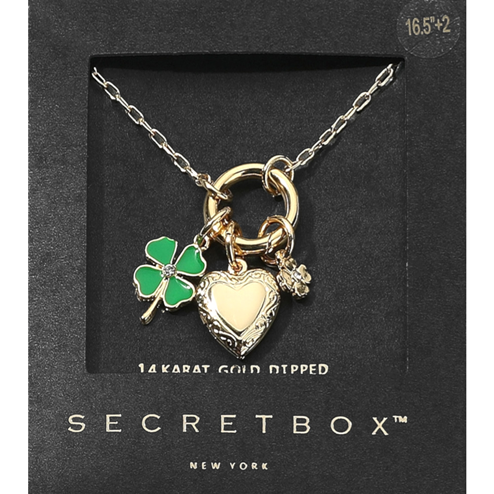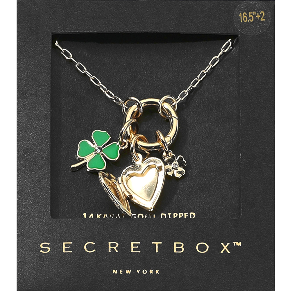 Details • Necklace Size : 16.5" + 2" L • Decor Size : 1.25" L • Elegant gold-plated link necklace featuring a porcelain heart, “love” script charm, floral disc, and pearl accent. A romantic and artsy piece from Secret Box New York – perfect for stylish gifting or statement accessorizing. • Gold Dipped