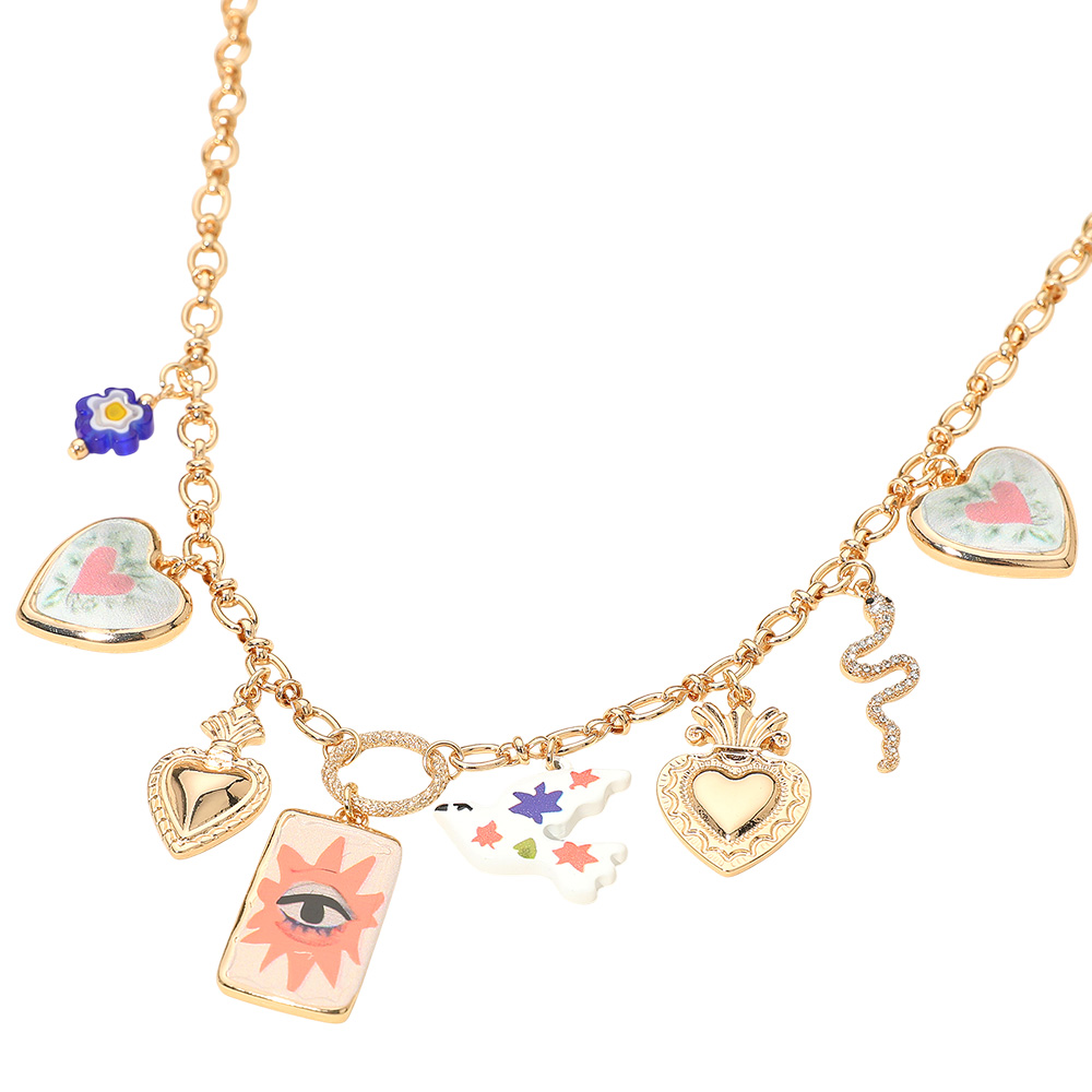 • Stylish charm necklace featuring a mix of hearts, symbolic pendants, and whimsical motifs. Designed with artistic details that express individuality and elegance, this statement necklace adds a playful yet meaningful accent to any outfit. Perfect for gifting or everyday wear.