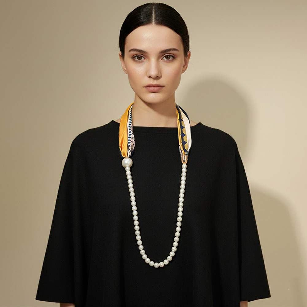 • Stylish beaded necklace enhanced with a patterned scarf accent, blending modern design with timeless charm. Ideal for elevating both casual and formal outfits, this elegant accessory adds a refined touch of sophistication and individuality to any look.