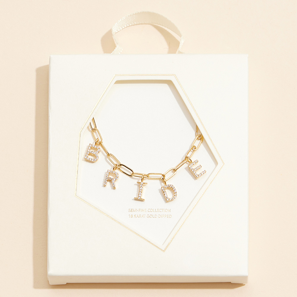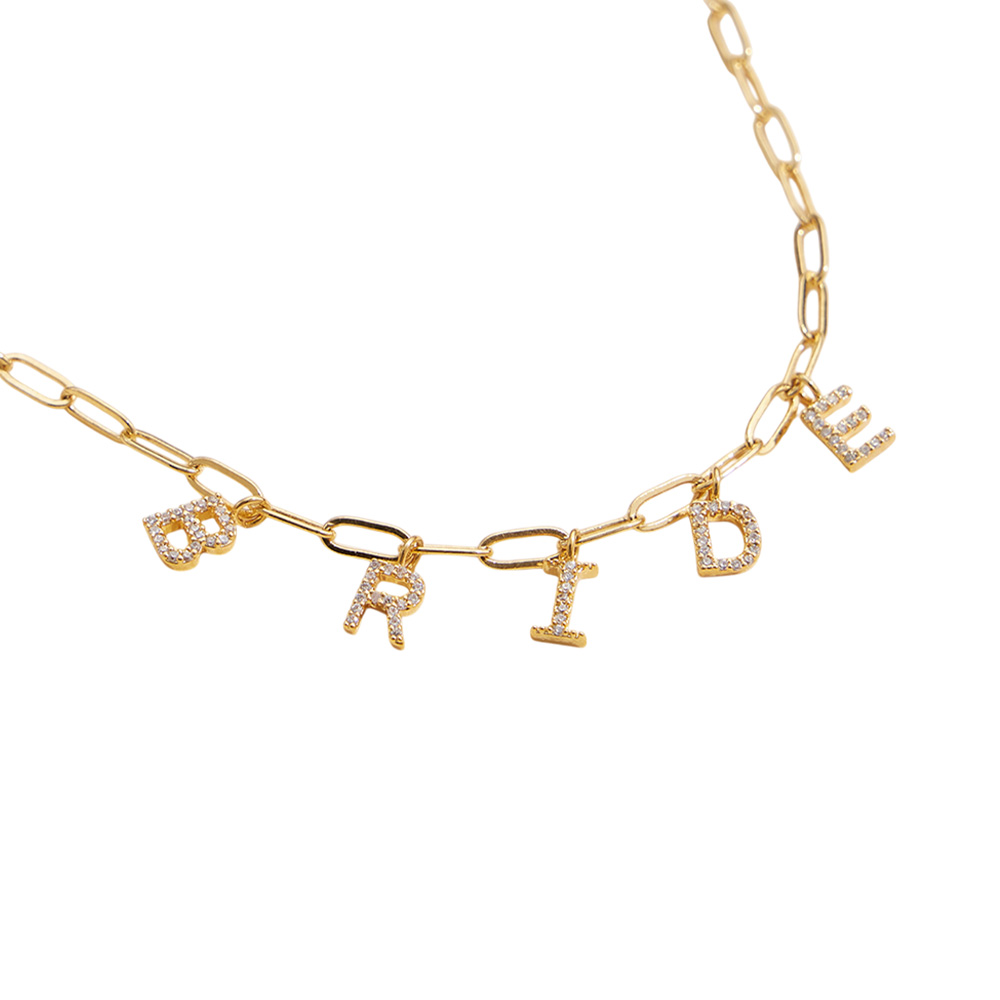 Semi Fine Collection - 18K Gold Dipped Brass Metal Stone Paved BRIDE Monogram Charm Paperclip Chain Necklace