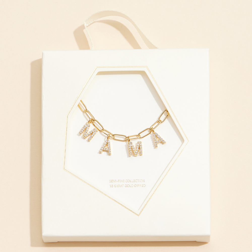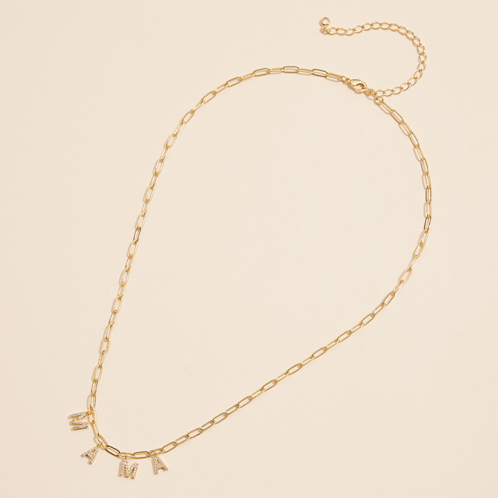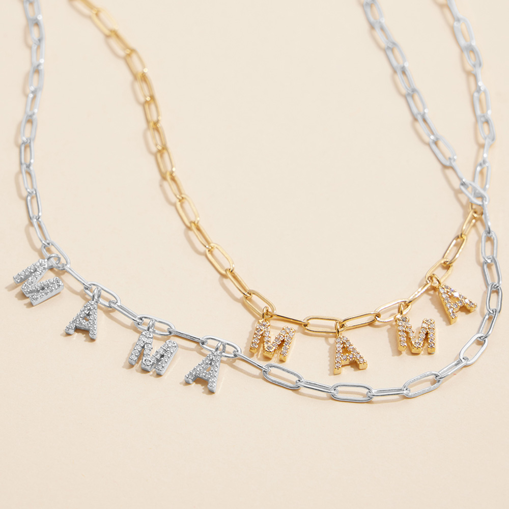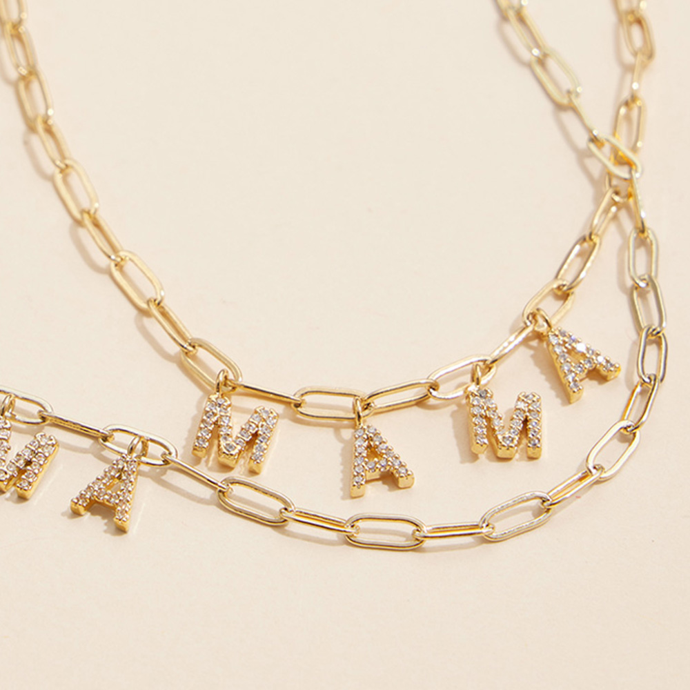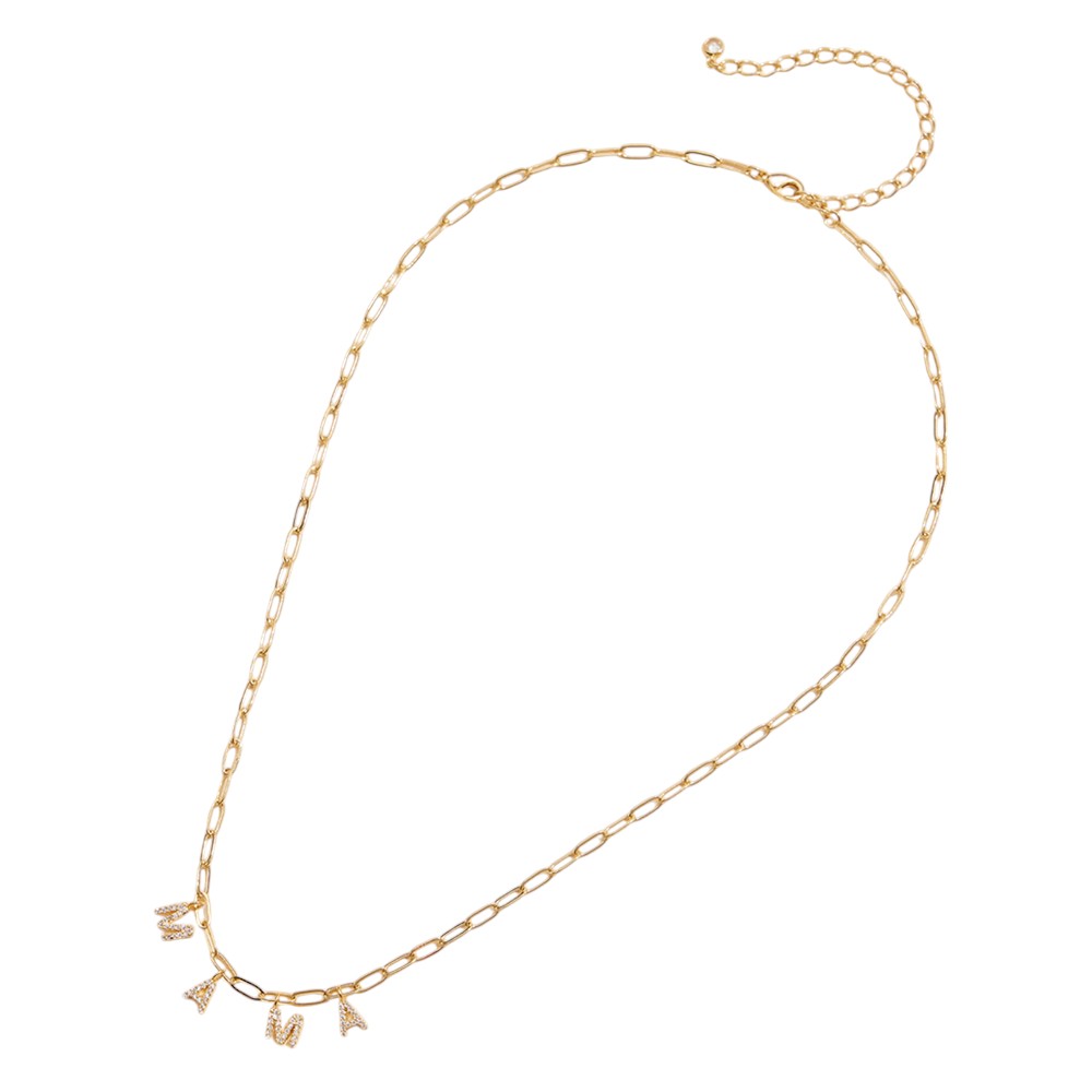 Semi Fine Collection - 18K Gold Dipped Brass Metal Stone Paved MAMA Monogram Charm Paperclip Chain Necklace