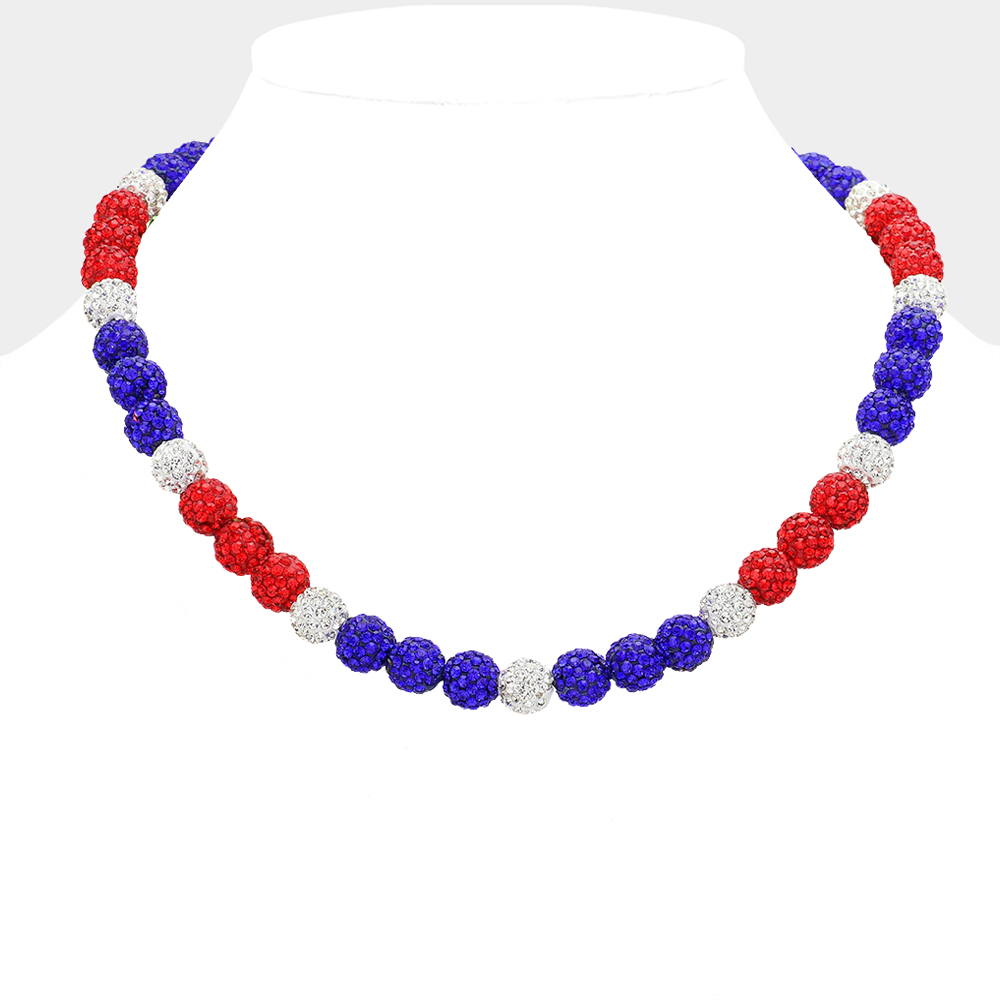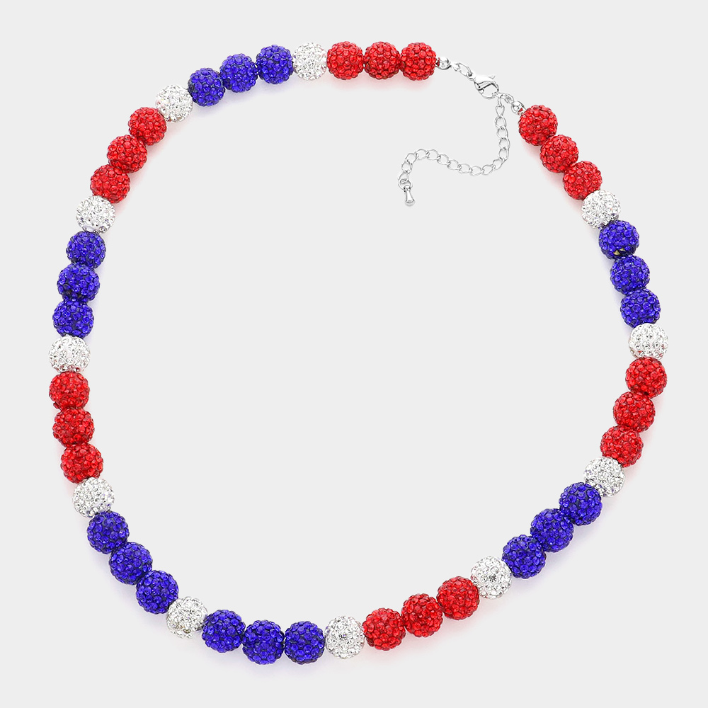 American USA Flag Shamballa Ball Accented Faceted Bead Long Necklace