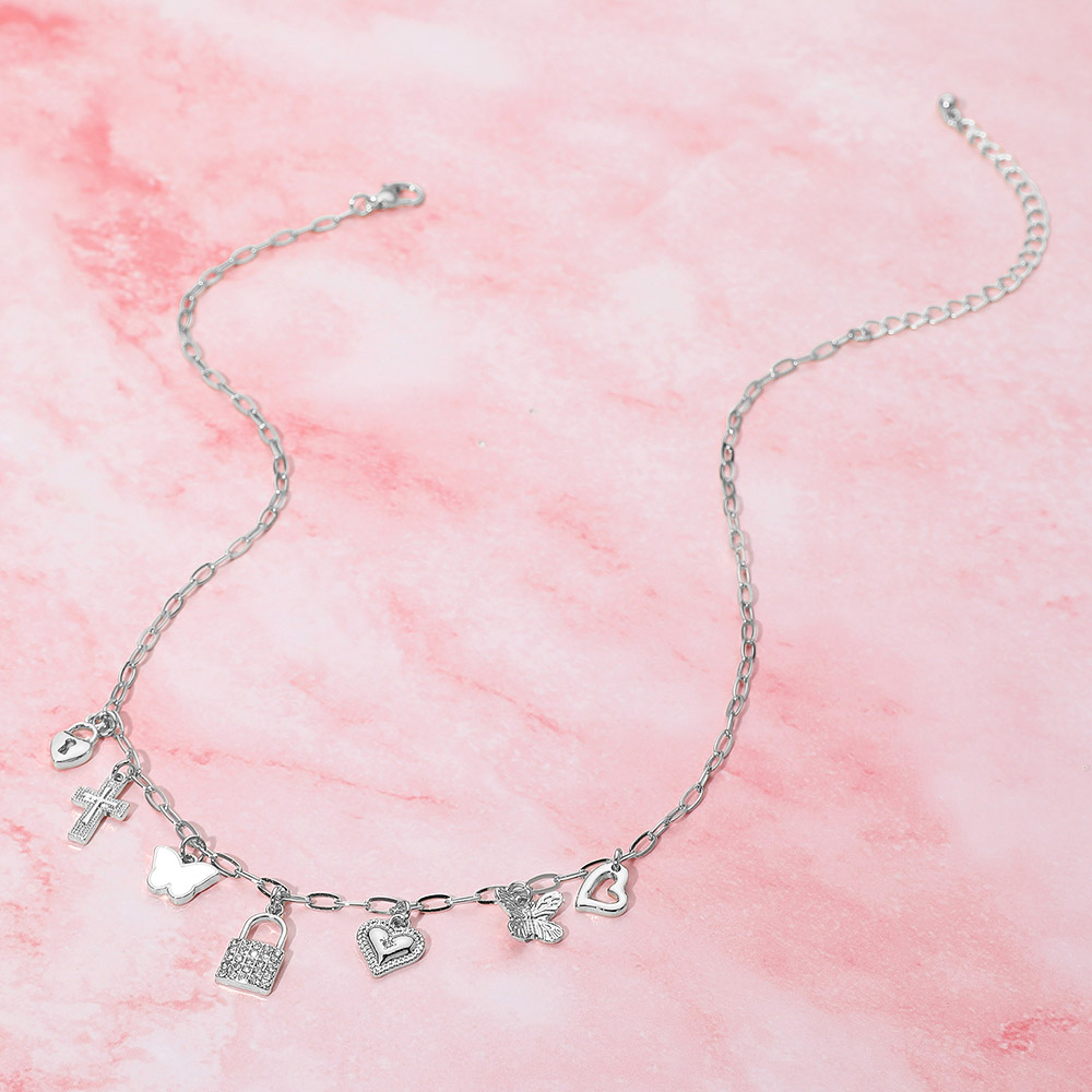 Details • Necklace Size : 16" + 3" L • Decor Size : 0.75" L • This delicate necklace features a mix of unique charms including hearts, a butterfly, a cross, and a padlock. A stylish piece to express personality and add a playful, symbolic touch to any outfit. • Sterling Silver Dipped • Lead and Nickel Compliant