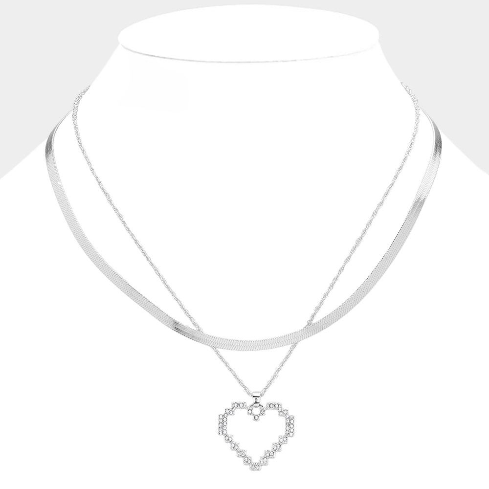 Silver Dipped Stone Paved Open Heart Pendant Snake Chain Layered Necklace