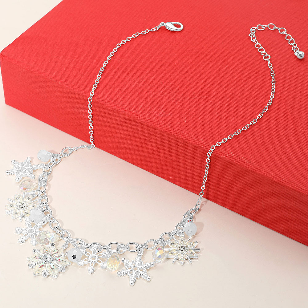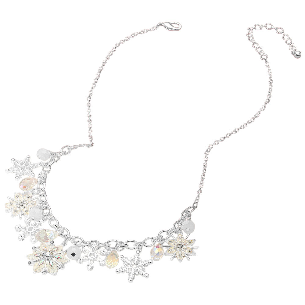 Details • Necklace Size : 18" + 3.25" L • Decor Size : 1.25" L • Elegant winter-themed necklace with dangling snowflake charms and faceted crystal-like accents. Perfect for holiday parties, seasonal events, or adding festive sparkle to your winter wardrobe. • Lead and Nickel Compliant
