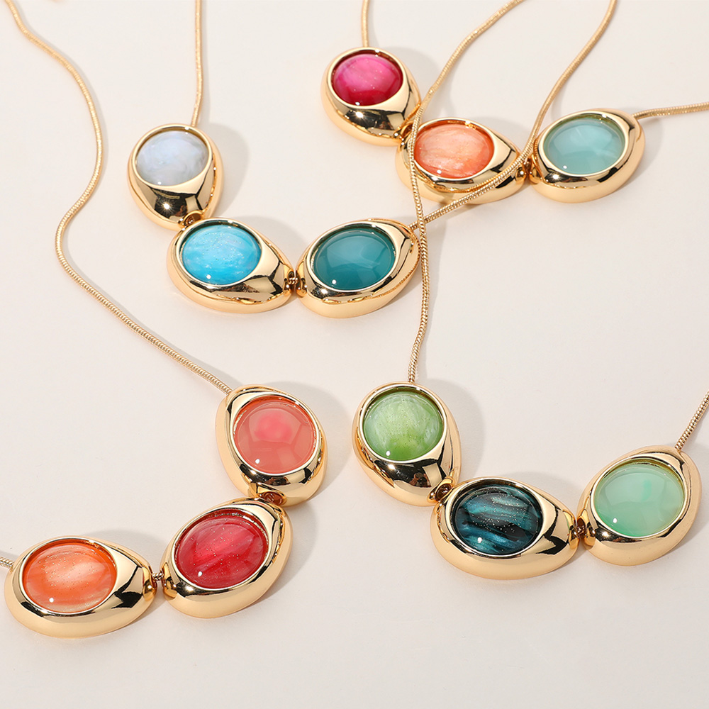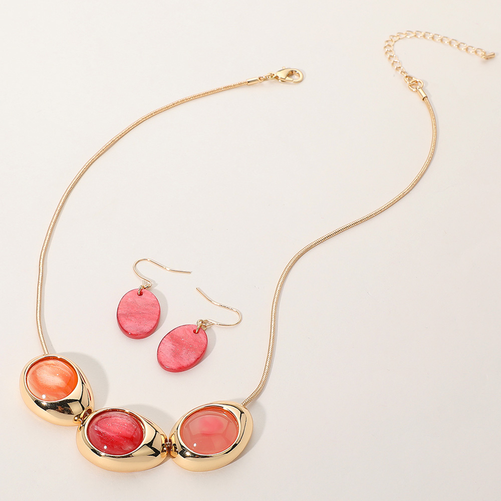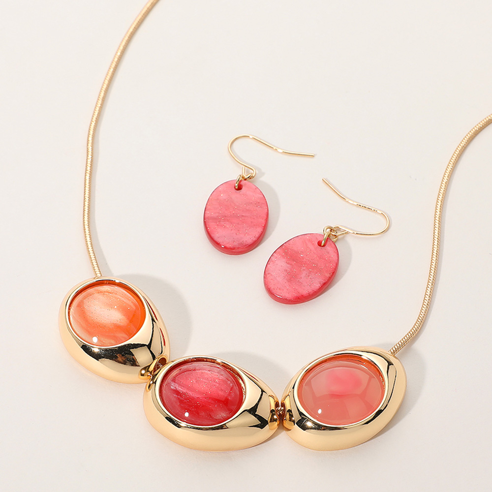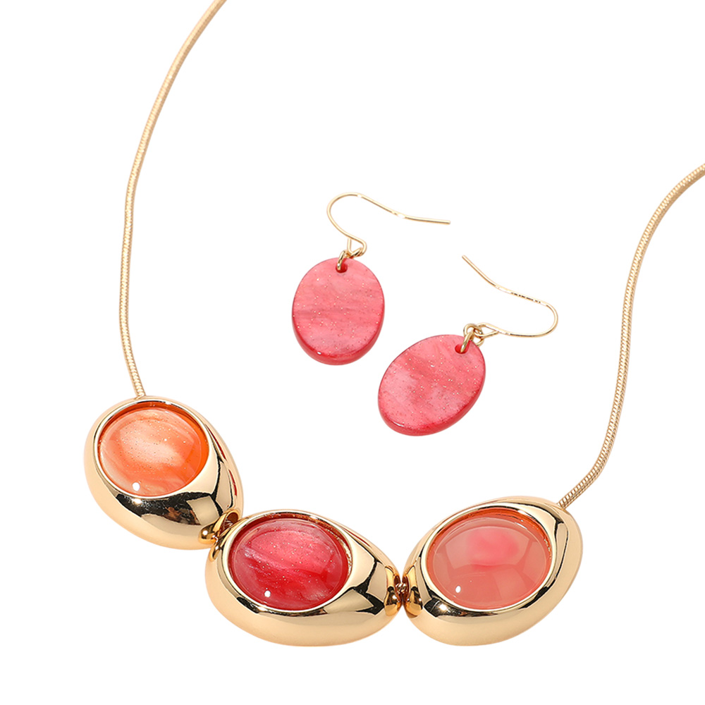 Details • Necklace Size : 19" + 3.5" L • Decor Size : 0.9" L • Earrings Size : 1.6" L • Oval pendant necklace with bold multi-tone stones and matching drop earrings, creating a sleek and modern statement look. This jewelry set blends contemporary style with artistic flair, perfect for elevating outfits at formal events, parties, or daily wear with a touch of unique elegance. • Lead and Nickel Compliant