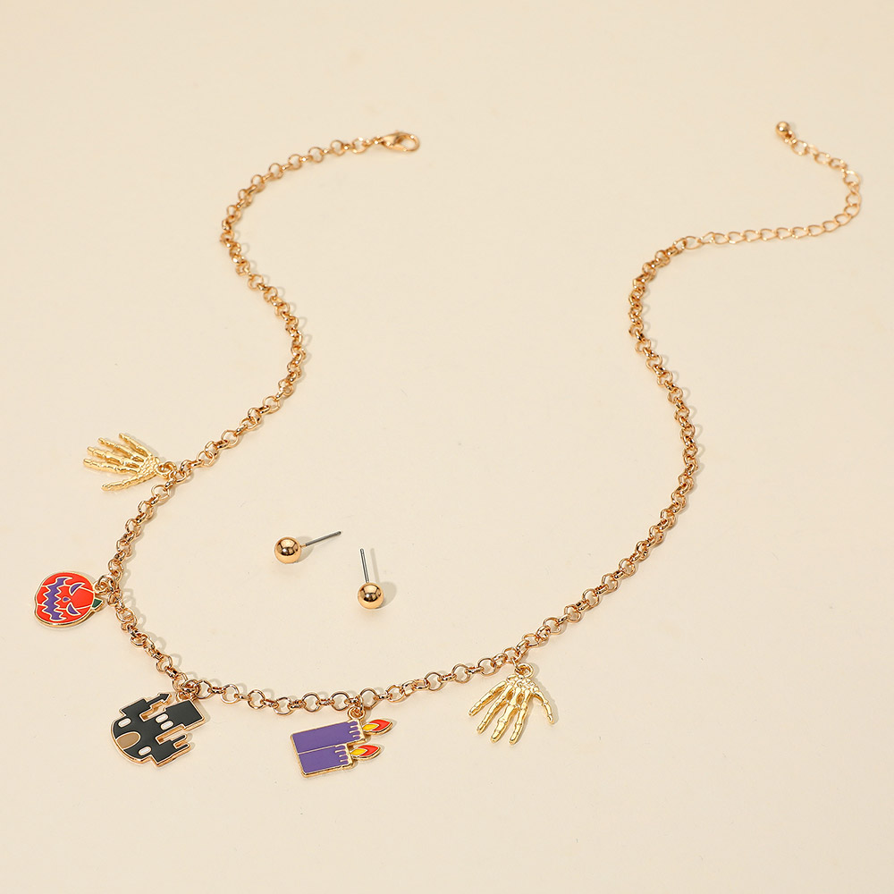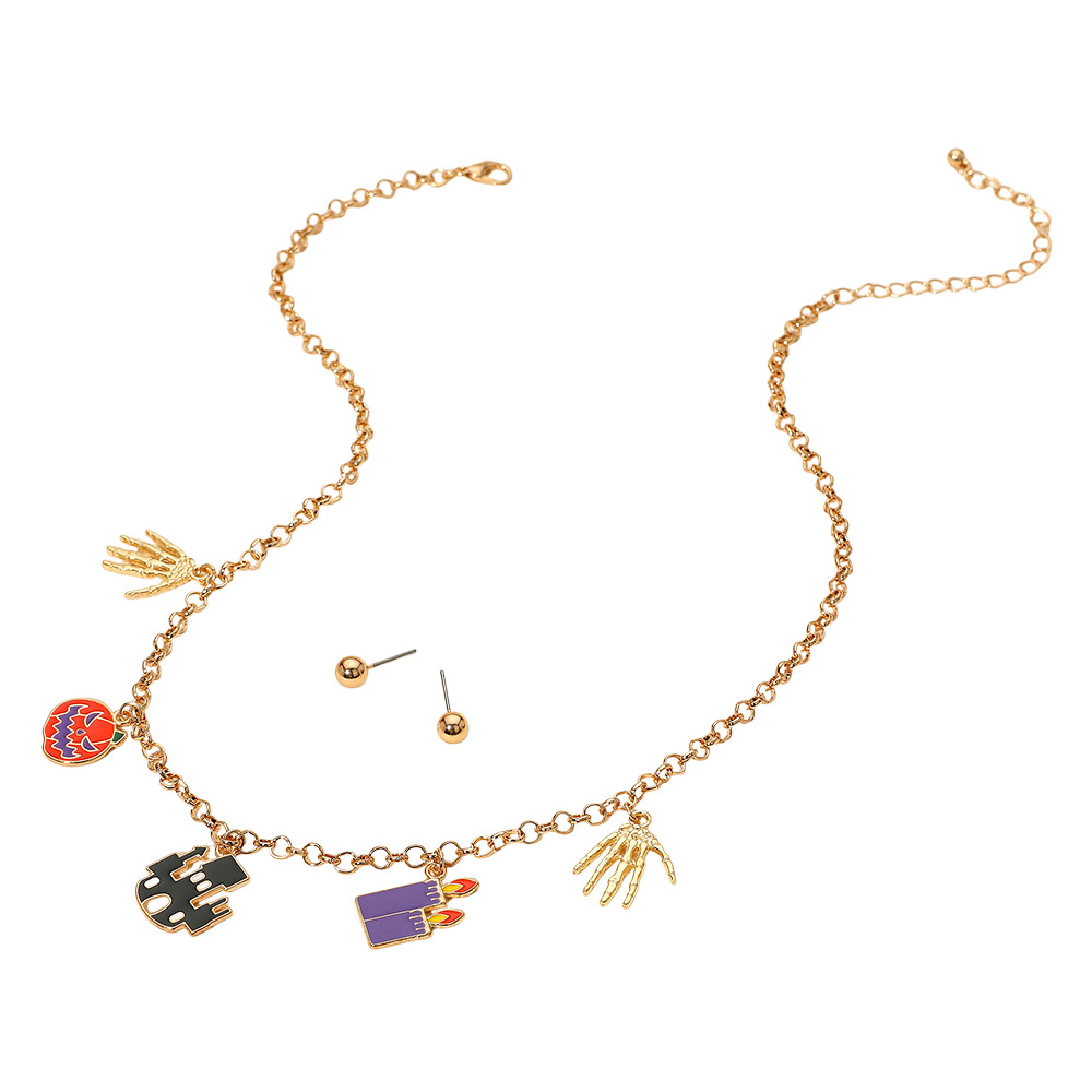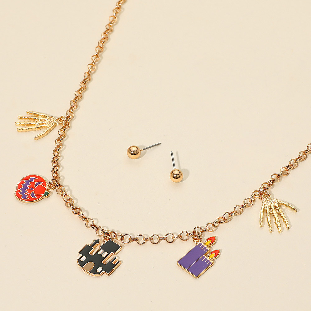 Details • Necklace Size : 18" + 3" L • Decor Size : 1" L • Earrings Size : 0.25" L • Halloween-themed necklace with haunted house, pumpkin, candle, and skeleton hand charms. Includes stud earrings. A fun accessory for costumes, parties, or seasonal style. • Lead and Nickel Compliant