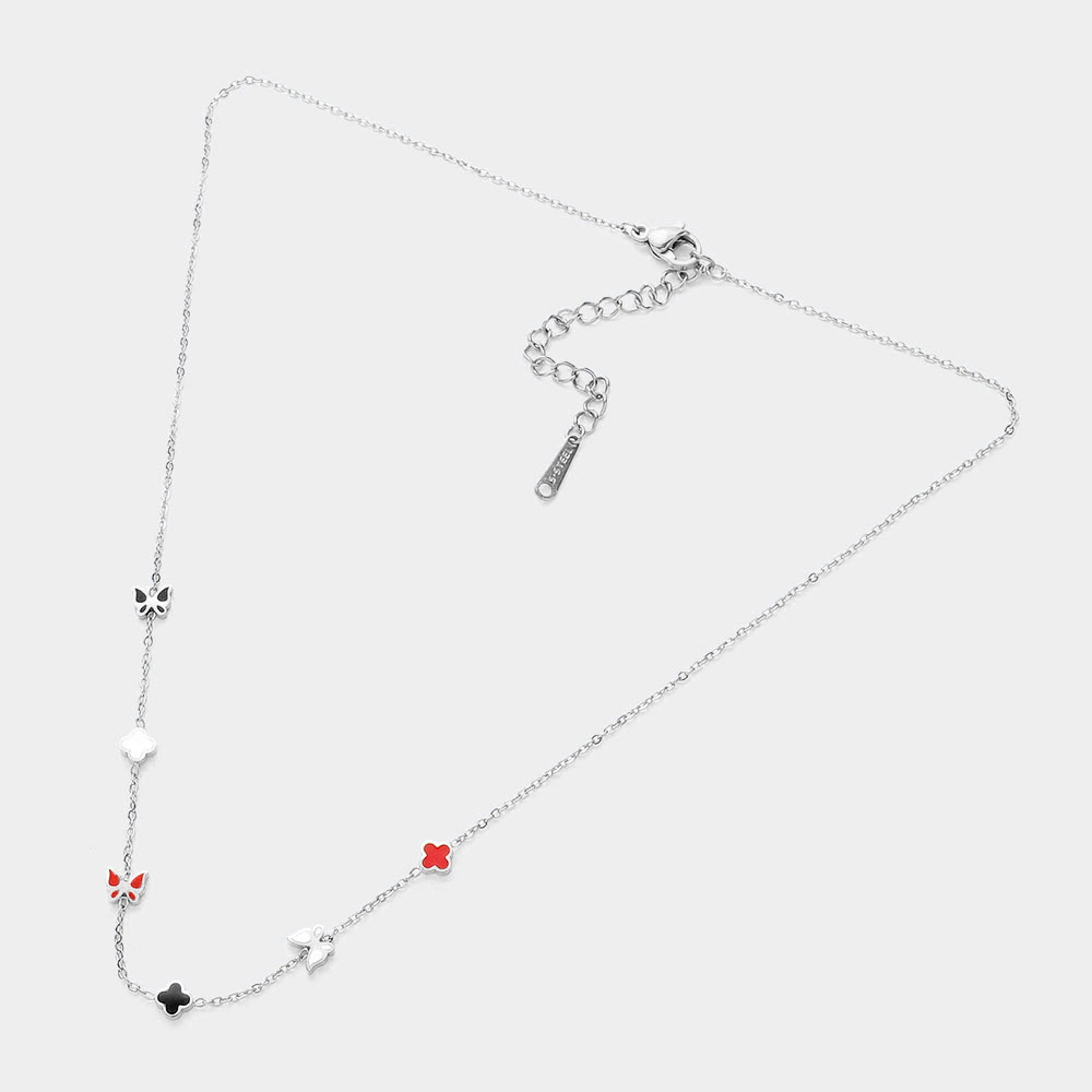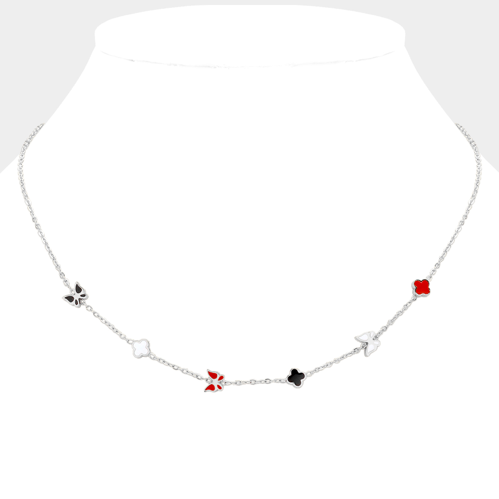 Stainless Steel Enamel Butterfly Quatrefoil Station Necklace