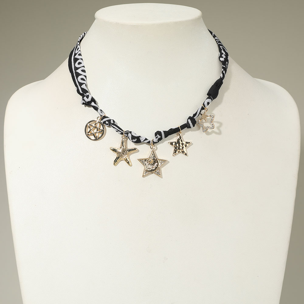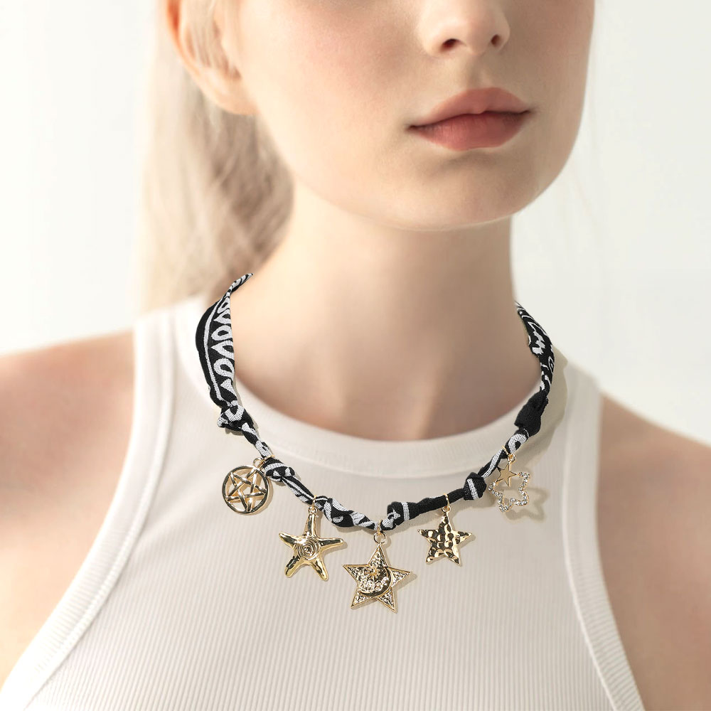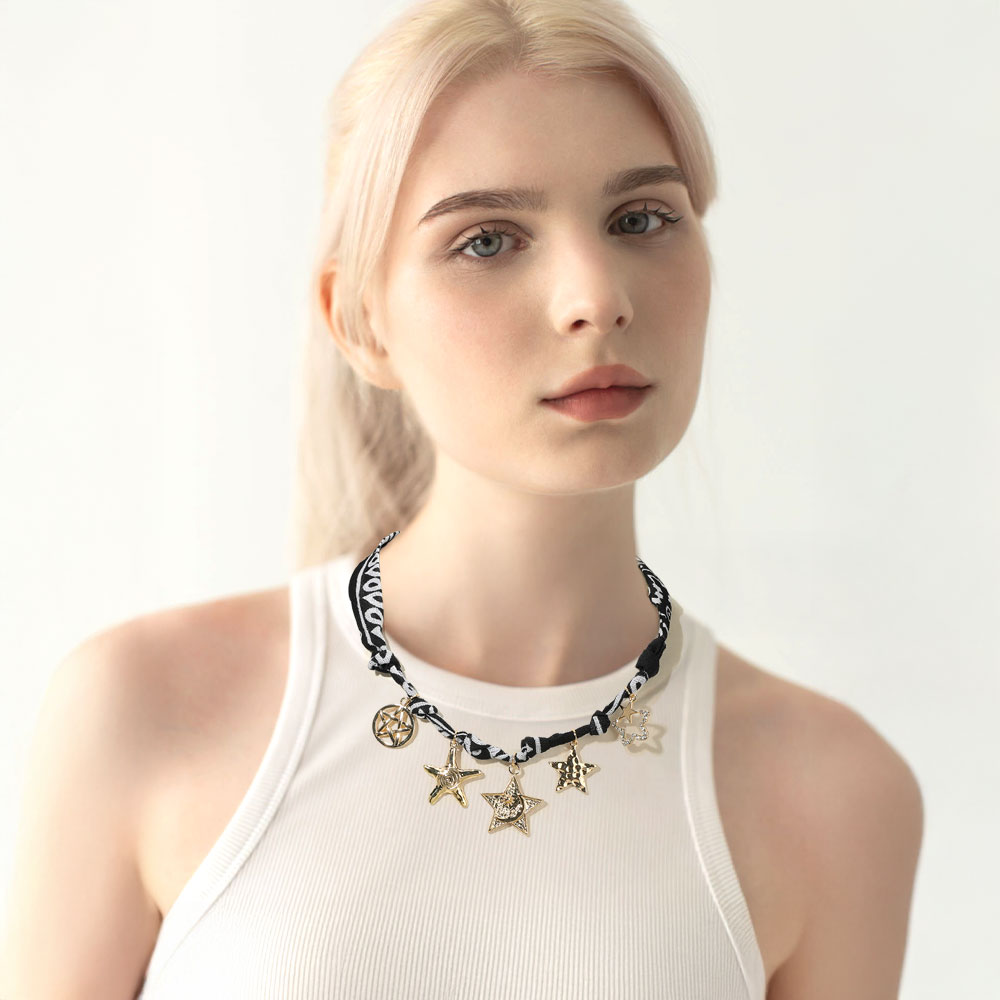 Details • Necklace Size : 16" + 3" L • Decor Size : 1.25" L • Stylish bandana necklace featuring an array of star-shaped charms and a pentagram pendant. Adjustable fit makes it perfect for layering or wearing alone, adding a bold and celestial-inspired touch to casual, festival, or statement looks. • Lead and Nickel Compliant