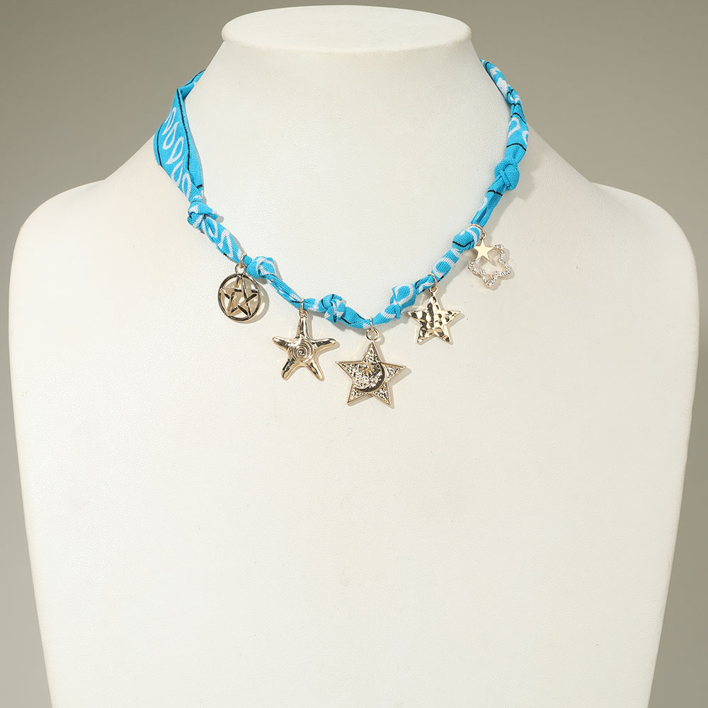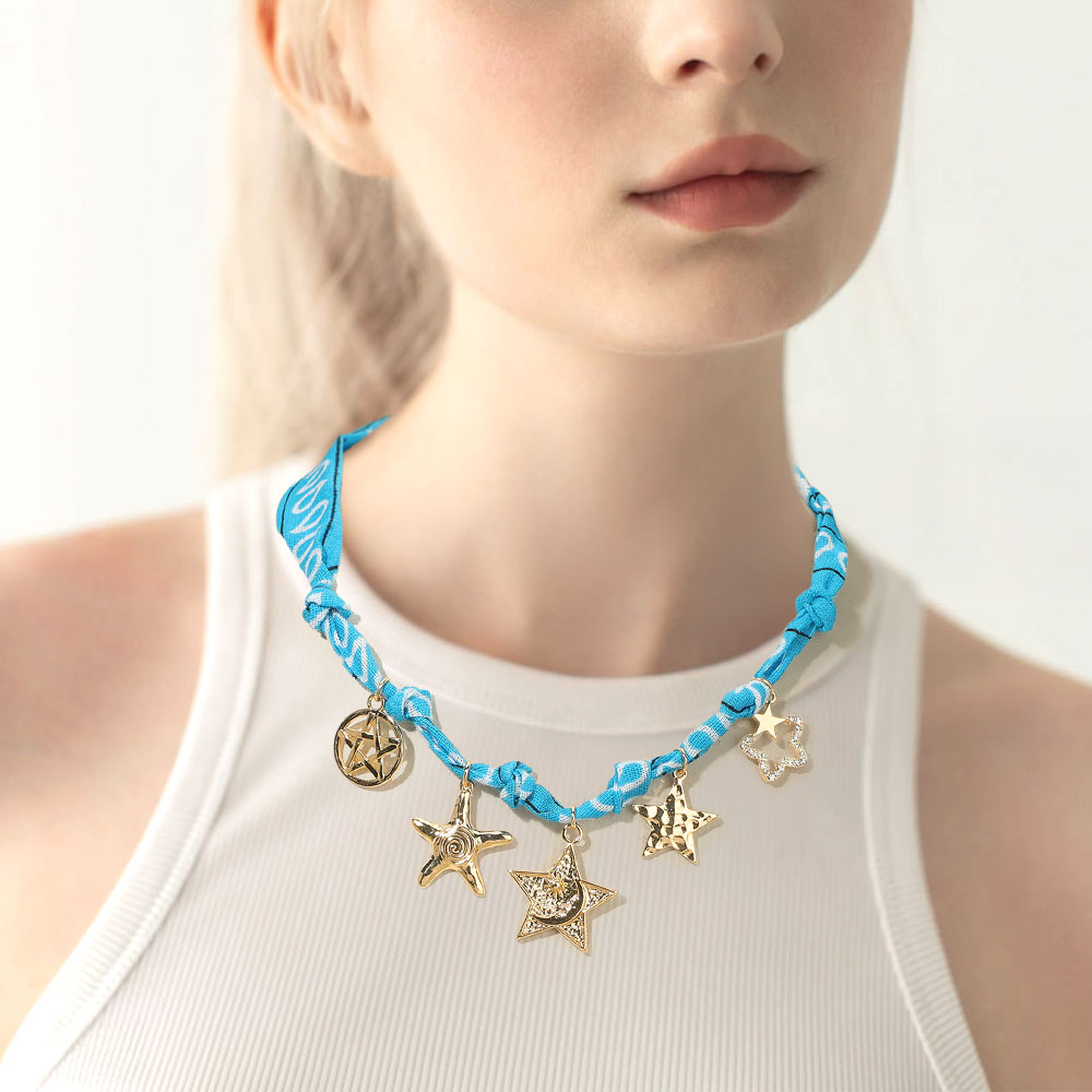 Details • Necklace Size : 16" + 3" L • Decor Size : 1.25" L • Stylish bandana necklace featuring an array of star-shaped charms and a pentagram pendant. Adjustable fit makes it perfect for layering or wearing alone, adding a bold and celestial-inspired touch to casual, festival, or statement looks. • Lead and Nickel Compliant