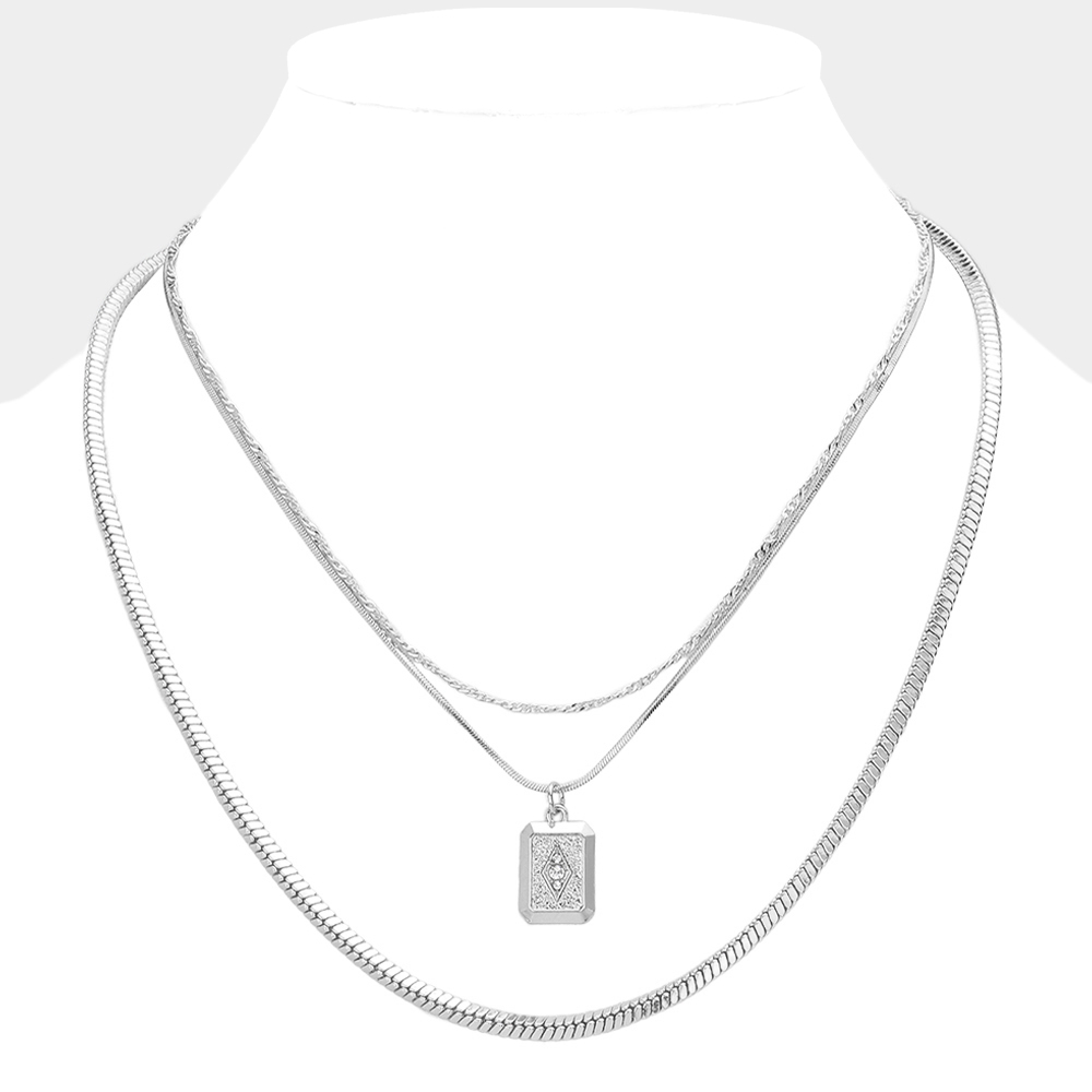 Stone Centered Brass Metal Octagon Pendant Triple Layered Necklace