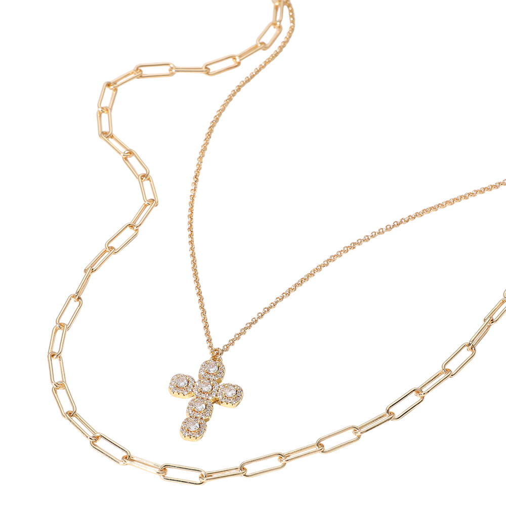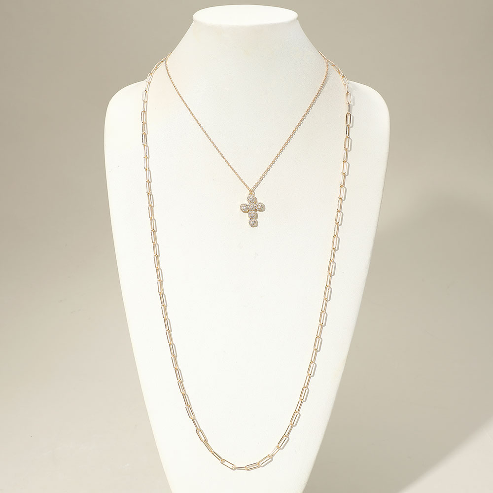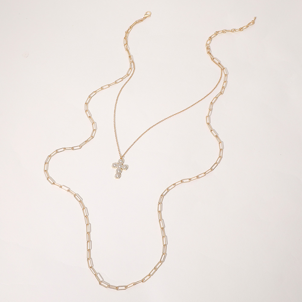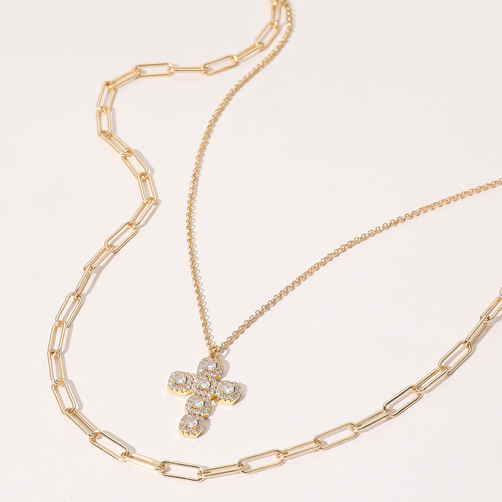 Stone Cluster Cross Pendant Pointed Paperclip Chain Layered Necklace