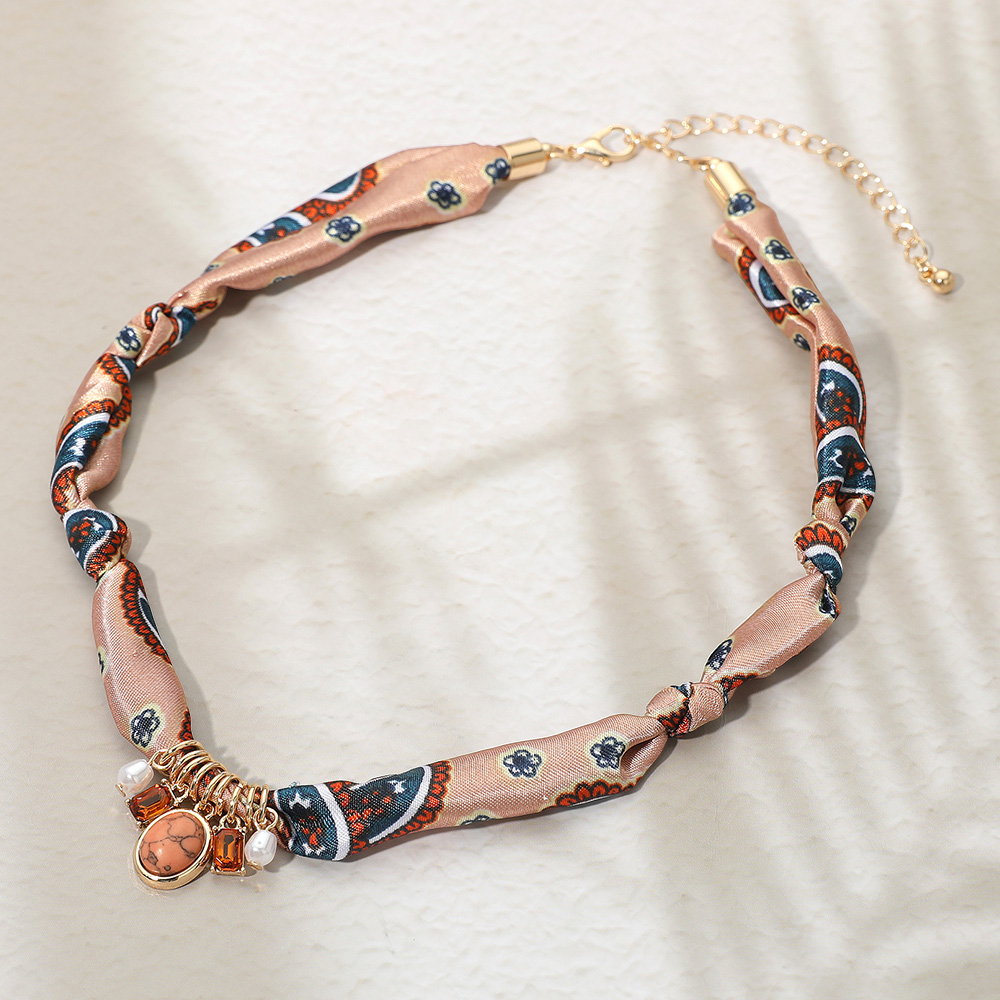 Details • Necklace Size : 15.5" + 3.5" L • Decor Size : 0.8" L • Pattern May Vary • Make a bold fashion statement with this bohemian scarf necklace, accented with decorative charms and pearls. Featuring a unique patterned fabric design, this versatile piece adds a playful yet elegant touch to casual outfits or evening looks. • Lead and Nickel Compliant