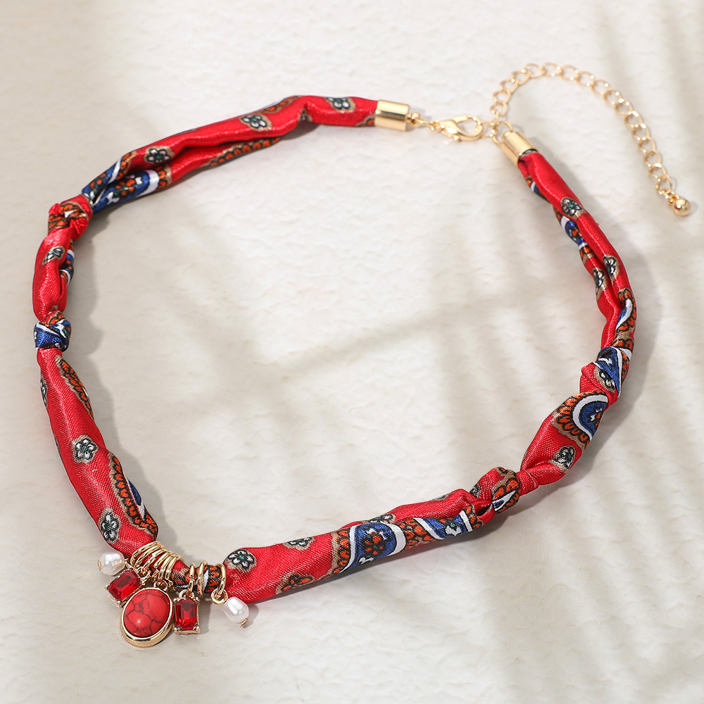 Details • Necklace Size : 15.5" + 3.5" L • Decor Size : 0.8" L • Pattern May Vary • Make a bold fashion statement with this bohemian scarf necklace, accented with decorative charms and pearls. Featuring a unique patterned fabric design, this versatile piece adds a playful yet elegant touch to casual outfits or evening looks. • Lead and Nickel Compliant