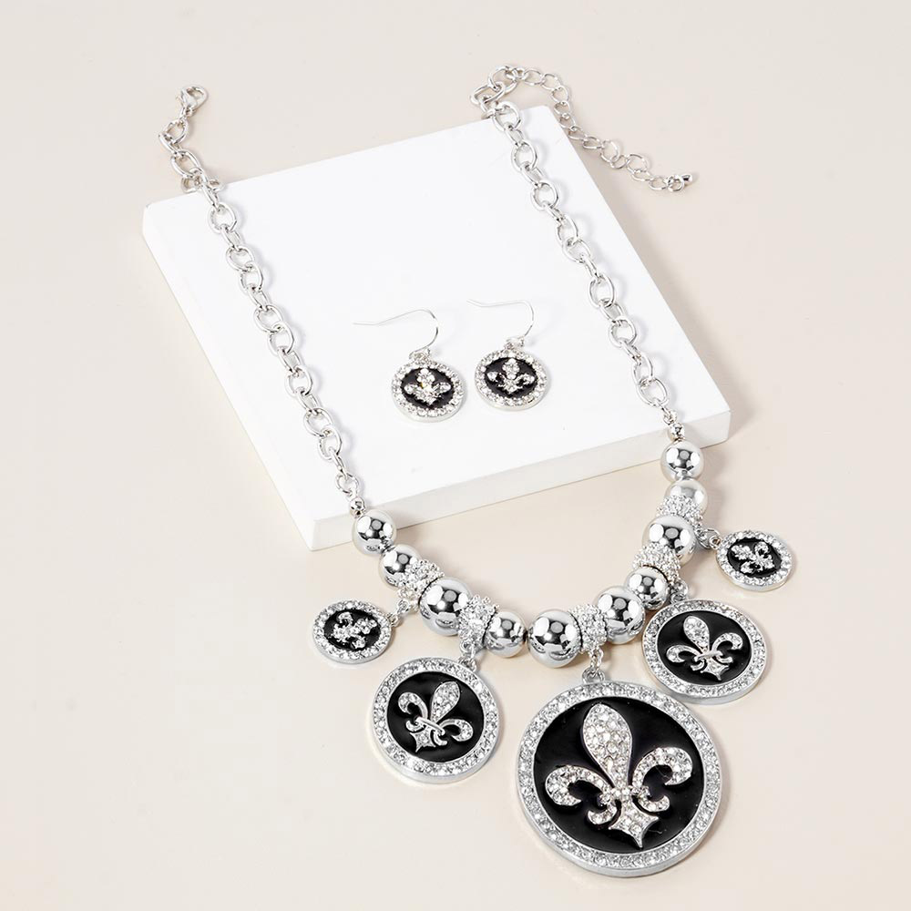 Stone Embellished Fleur de Lis Charm Metal Chain Necklace