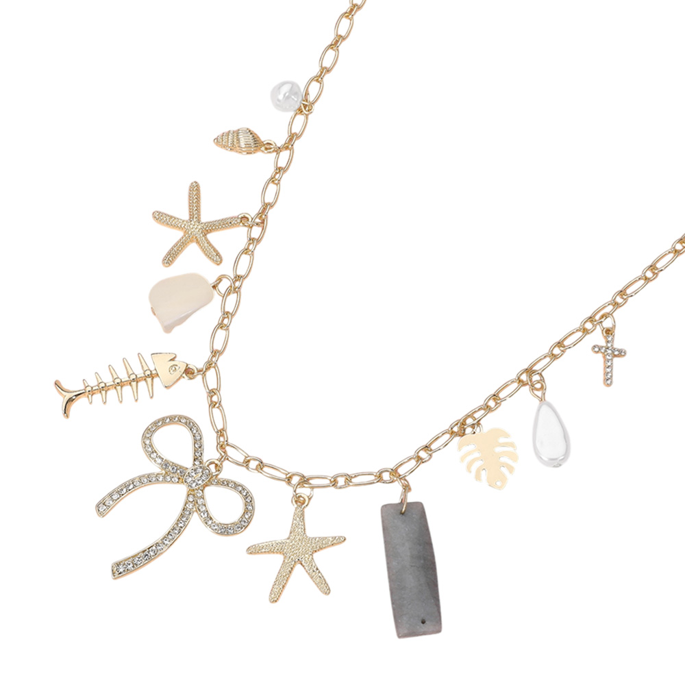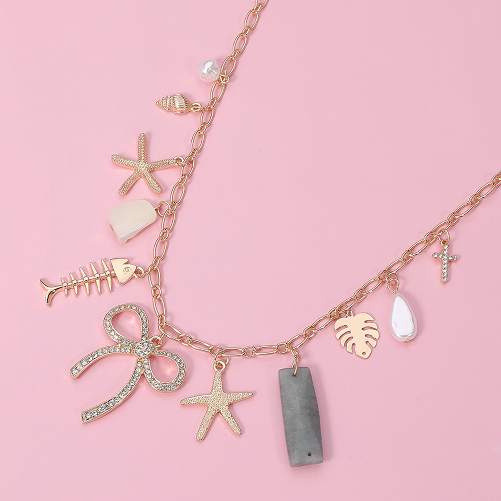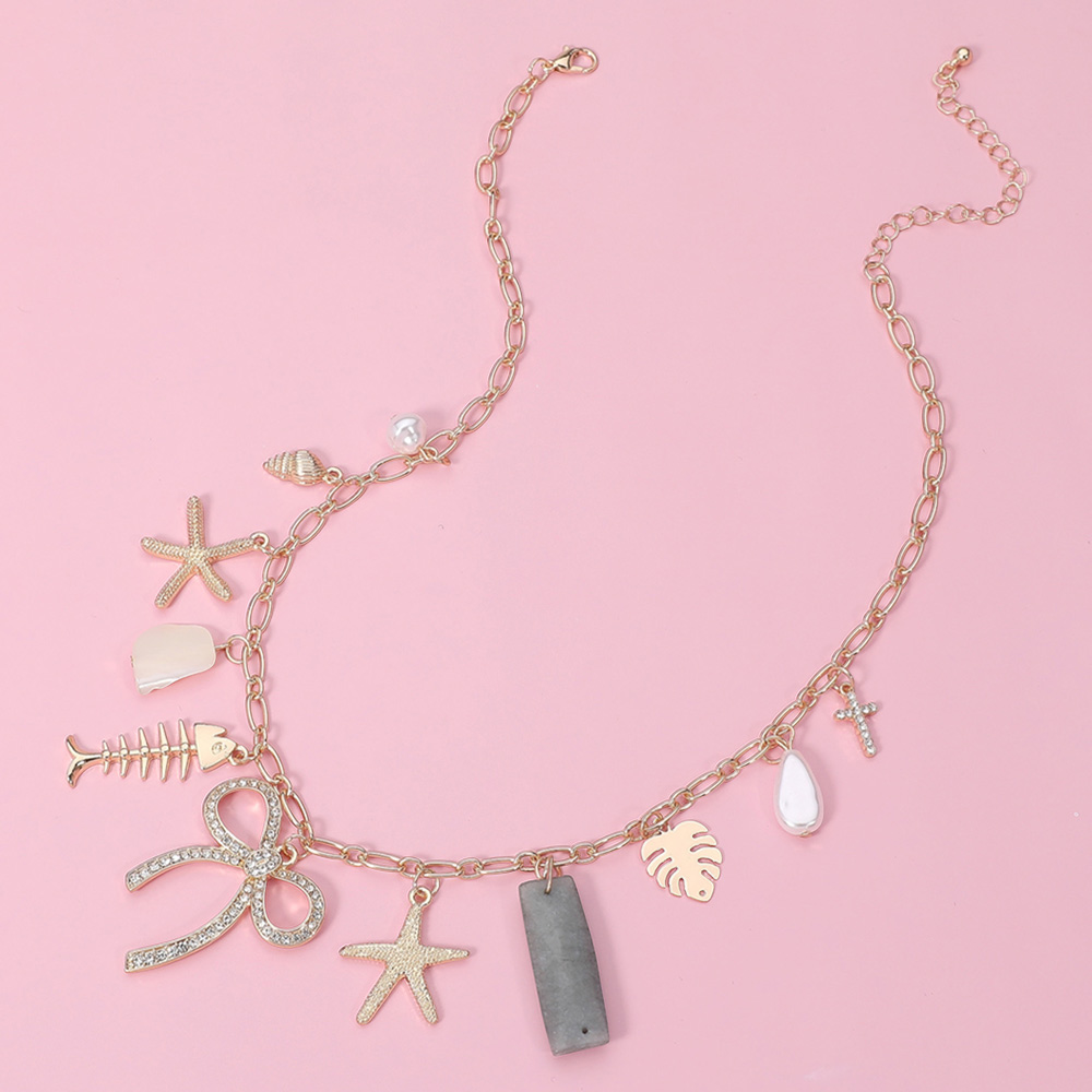 Stone Paved Bow Metal Starfish Fish Shell Pearl Tropical Leaf Charm Station Necklace