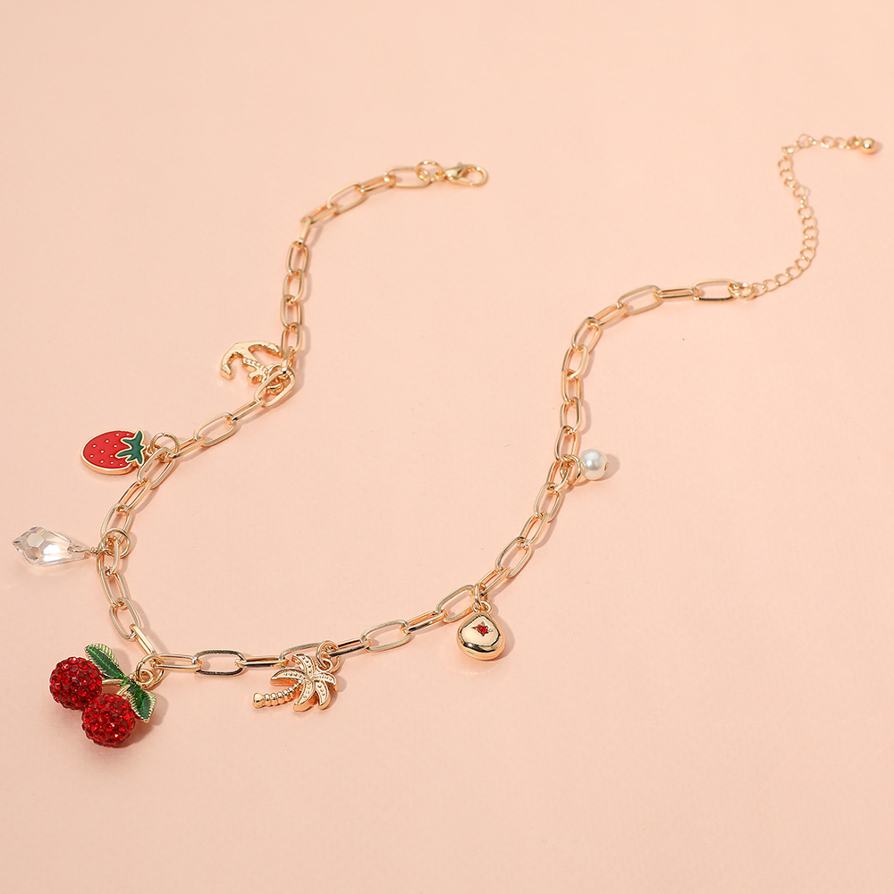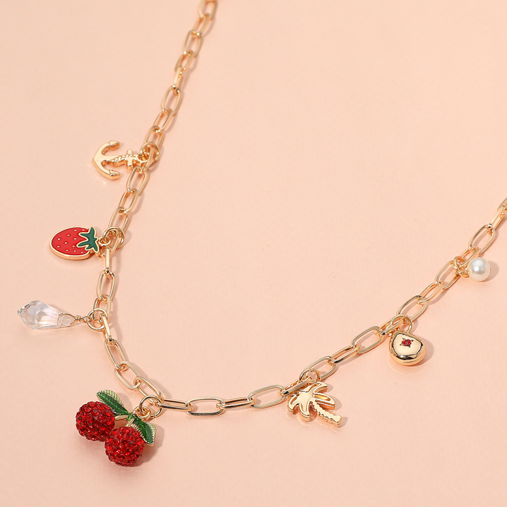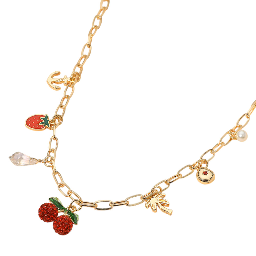Details • Necklace Size : 15" + 3" L • Decor Size : 1" L • Add a splash of fun to your look with this playful charm necklace featuring a variety of pendants including fruits, symbols, and accents. Perfect for layering or wearing solo, this unique piece is ideal for those who love expressive, whimsical accessories. • Lead and Nickel Compliant