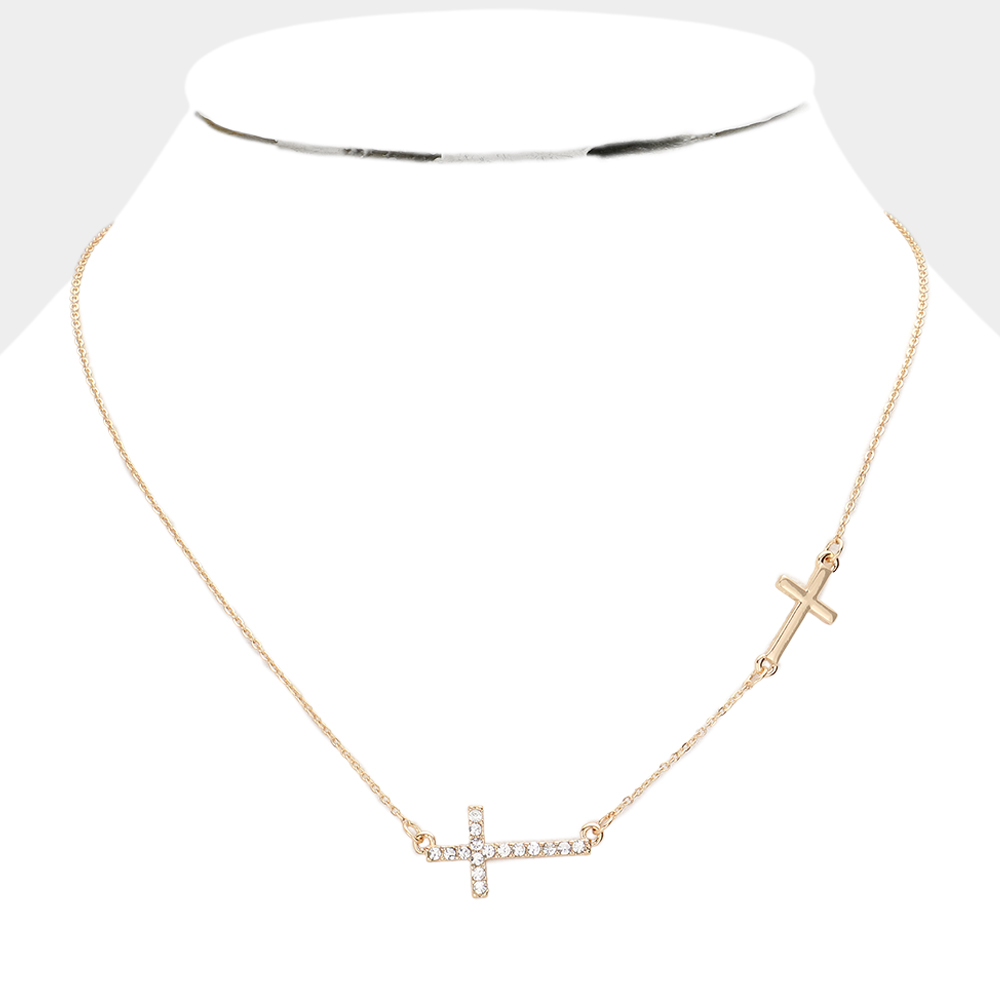 Stone Paved Cross Pendant Sideway Necklace