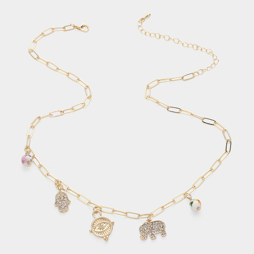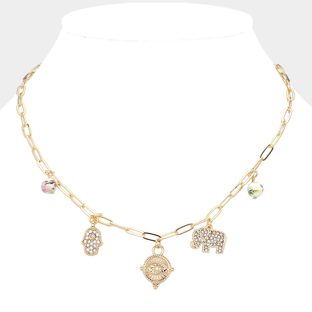 Stone Paved Evil Eye Hamsa Hand Elephant Ceramic Ball Charm Station Paperclip Chain Necklace