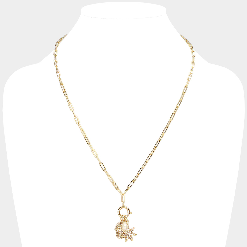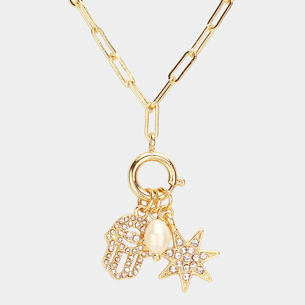 Stone Paved Hamsa Hand Sunburst Pearl Charm Pointed Paperclip Chain Necklace