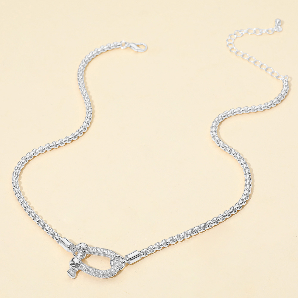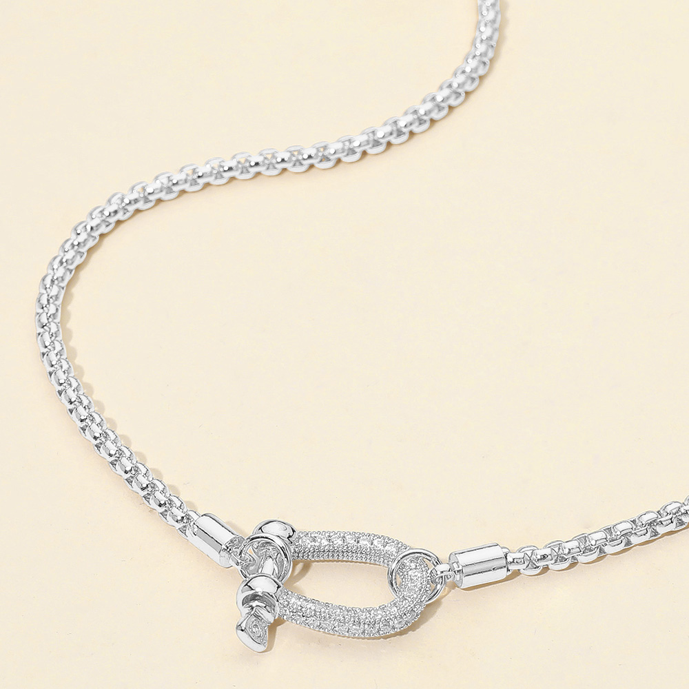 Details • Necklace Size : 16" + 3.5" L • Decor Size : 0.75" L • Elevate your style with this box chain necklace featuring a shimmering pave link carabiner pendant. Designed with a secure clasp and a bold, refined look, this statement piece adds elegance and sophistication to both everyday wear and special occasions. • Lead and Nickel Compliant